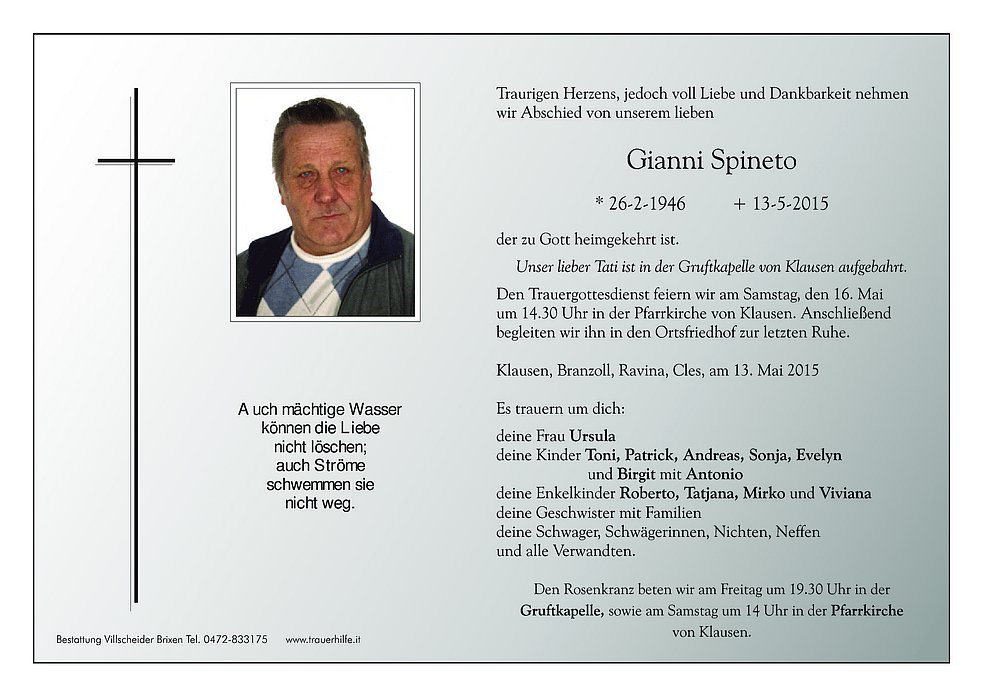 um 14.30 Uhr in der Pfarrkirche von Klausen. Anschließend begleiten wir ihn in den Ortsfriedhof zur letzten Ruhe.
