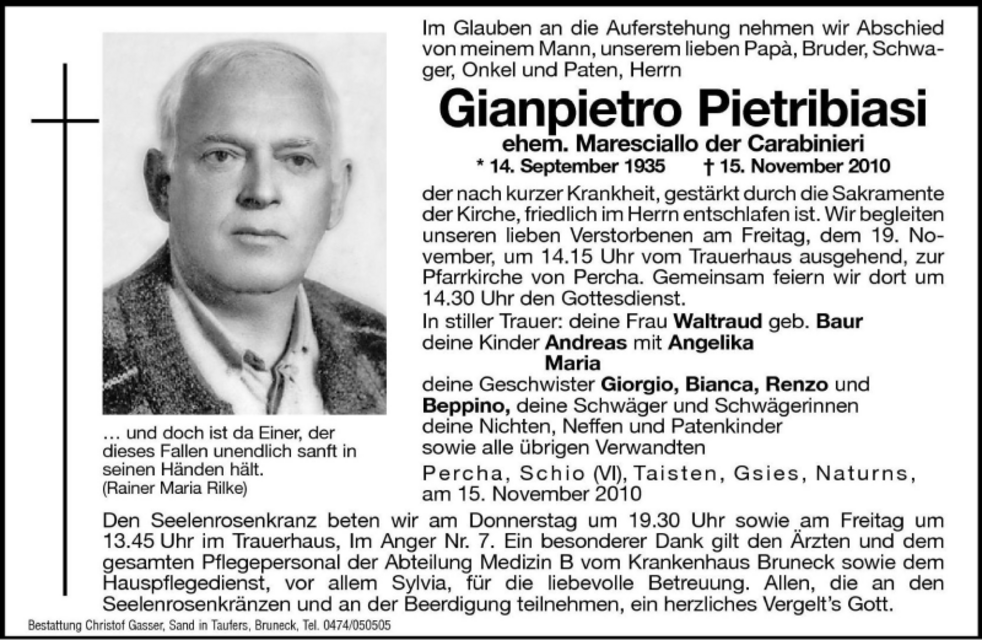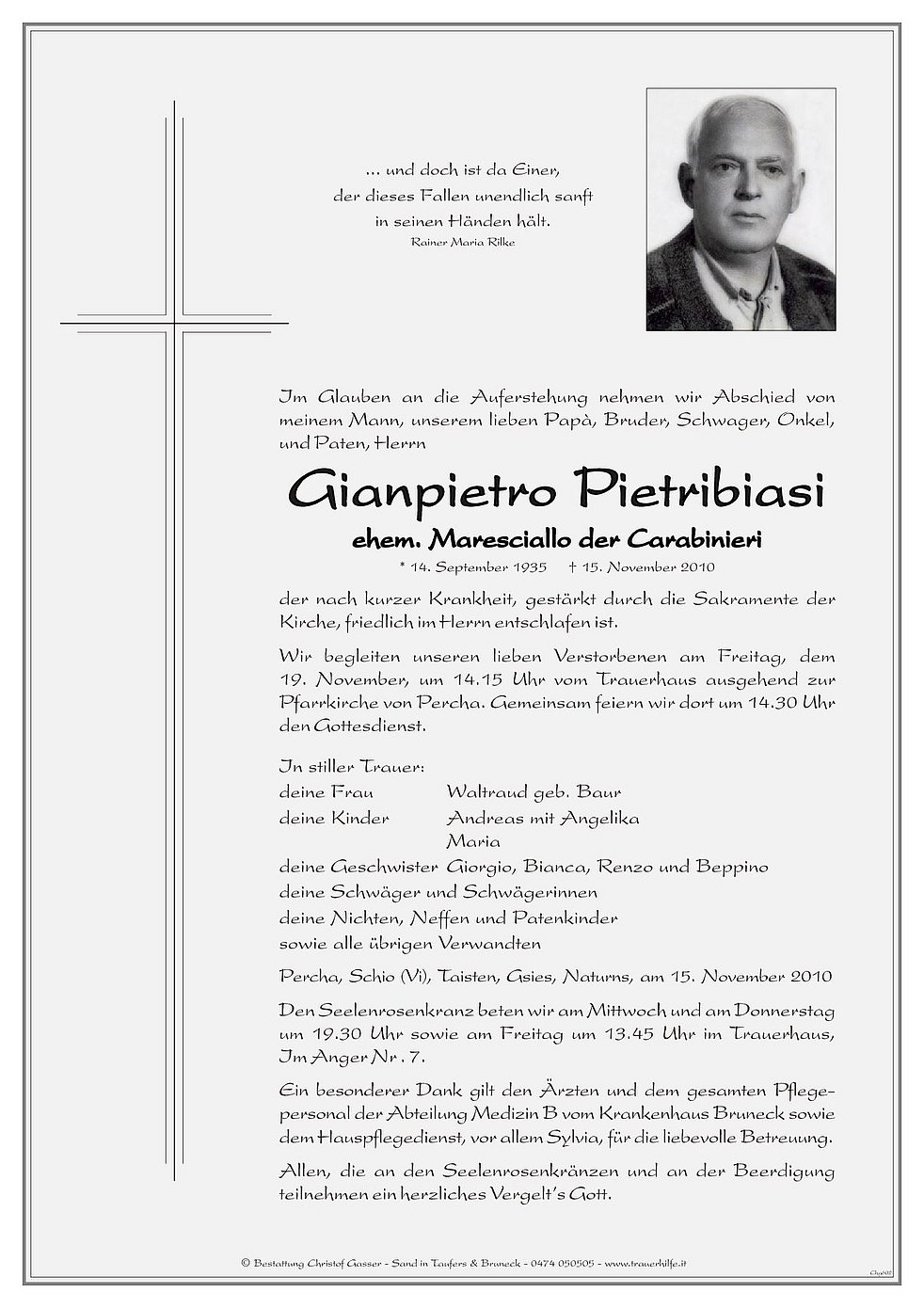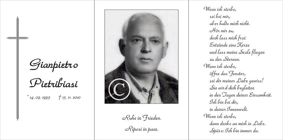 Im Glauben an die Auferstehung nehmen wir Abschied von meinem Mann, unserem lieben Papà, Bruder, Schwager, Onkel, und Paten, Herrn