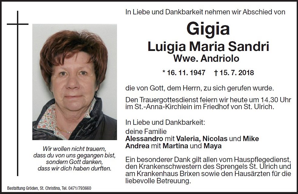 Den Trauergottesdienst feiern wir morgen, Dienstag, um 14:30 Uhr im St.-Anna-Kirchlein im Friedhof von St. Ulrich.