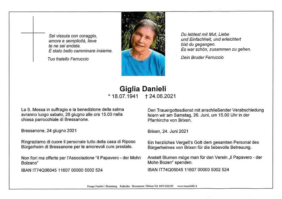 Anstatt Blumen möge man für den Verein „il Papavero - der Mohn Bozen“ spenden. IBAN IT74Q06045 11607 00000 5002 524