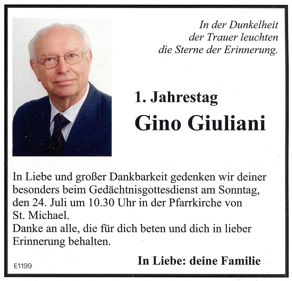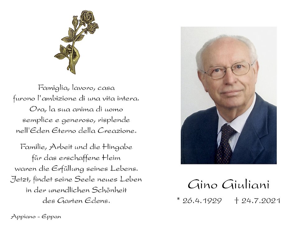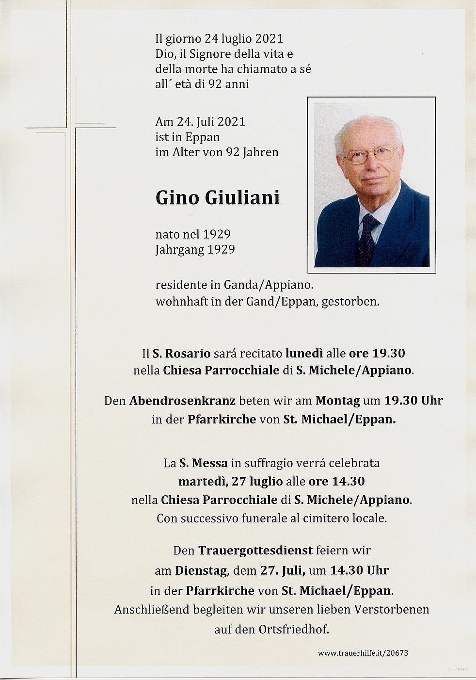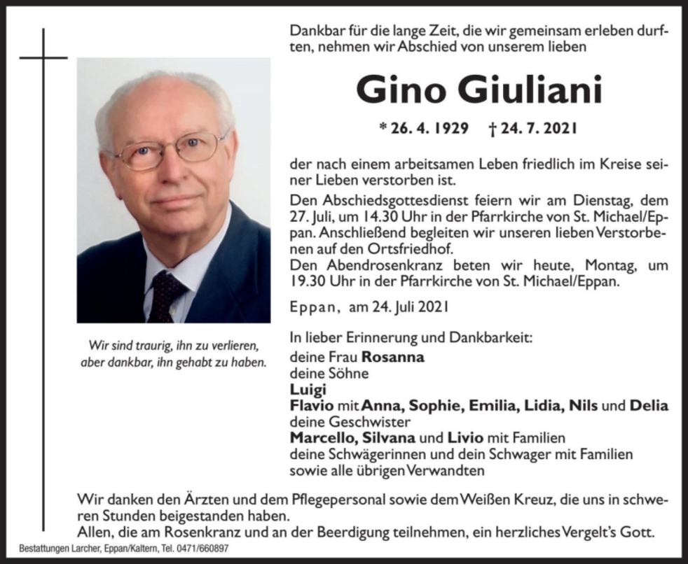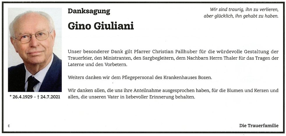 Den Abschiedsgottesdienst feiern wir am Dienstag, dem 27. Juli, um 14.30 Uhr in der Pfarrkirche von St. Michael/Eppan. Anschließend begleiten wir unseren lieben Verstorbenen auf den Ortsfriedhof.