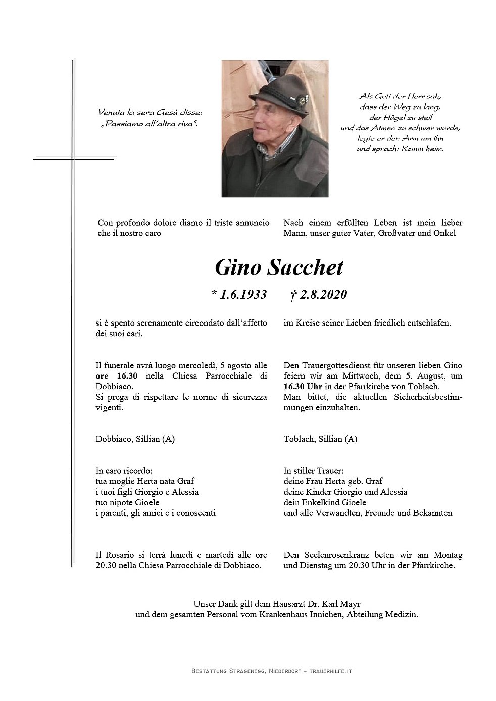Den Trauergottesdienst für unseren lieben Gino feiern wir am Mittwoch, dem 5. August, um 16.30 Uhr in der Pfarrkirche von Toblach.