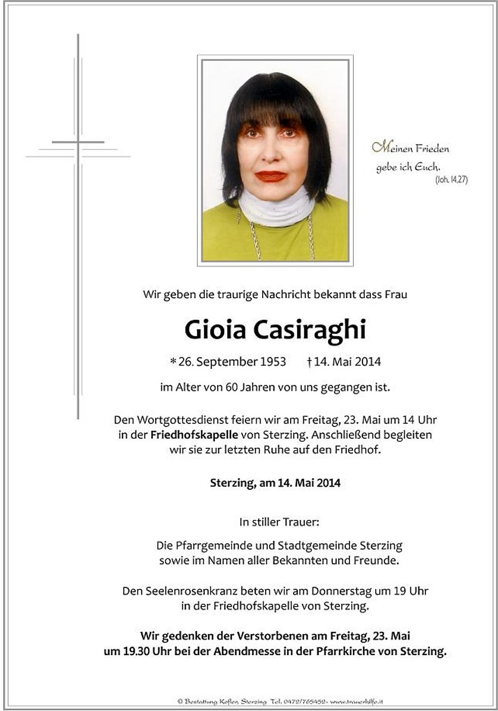 um 14 Uhr in der Friedhofskapelle von Sterzing.