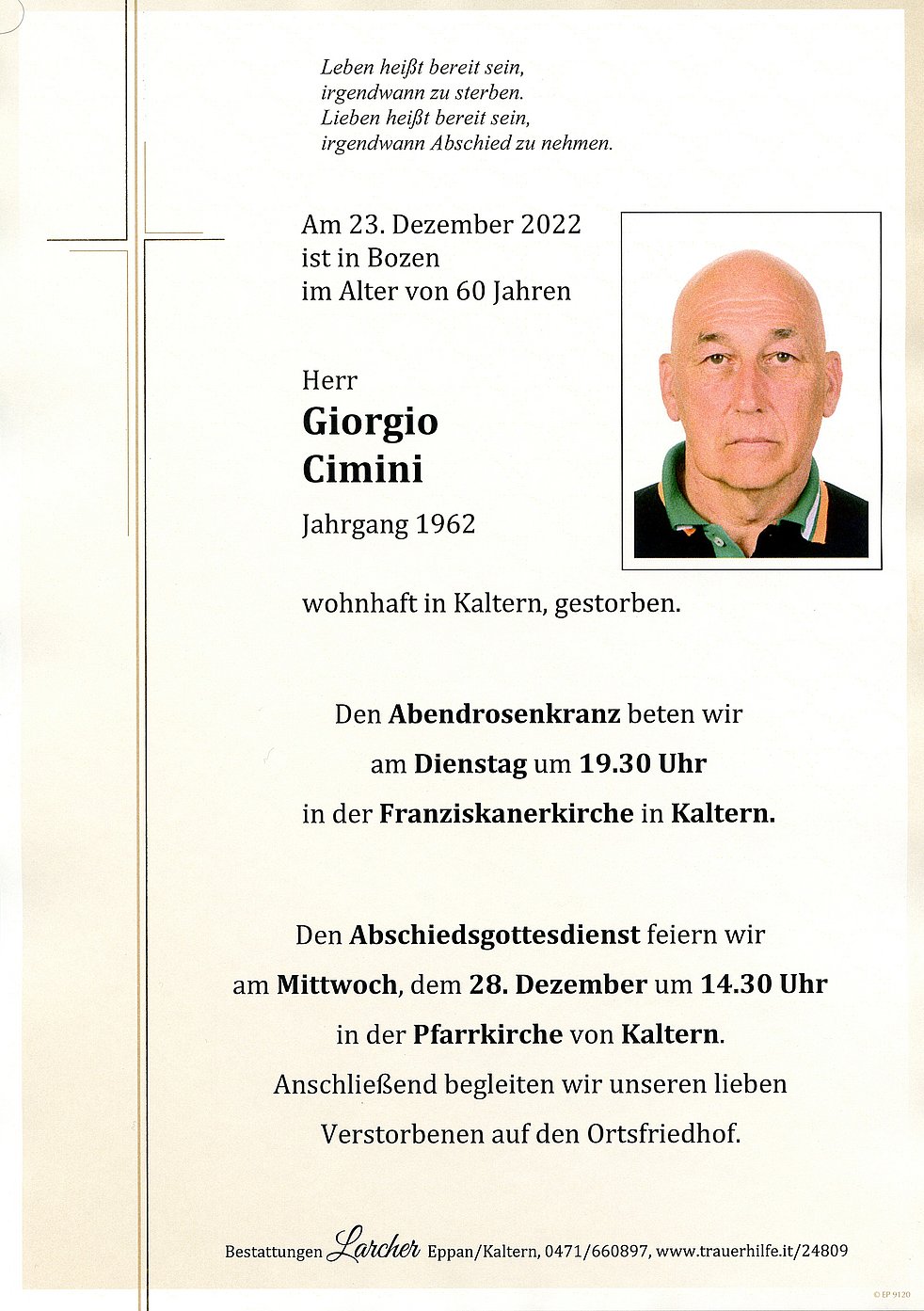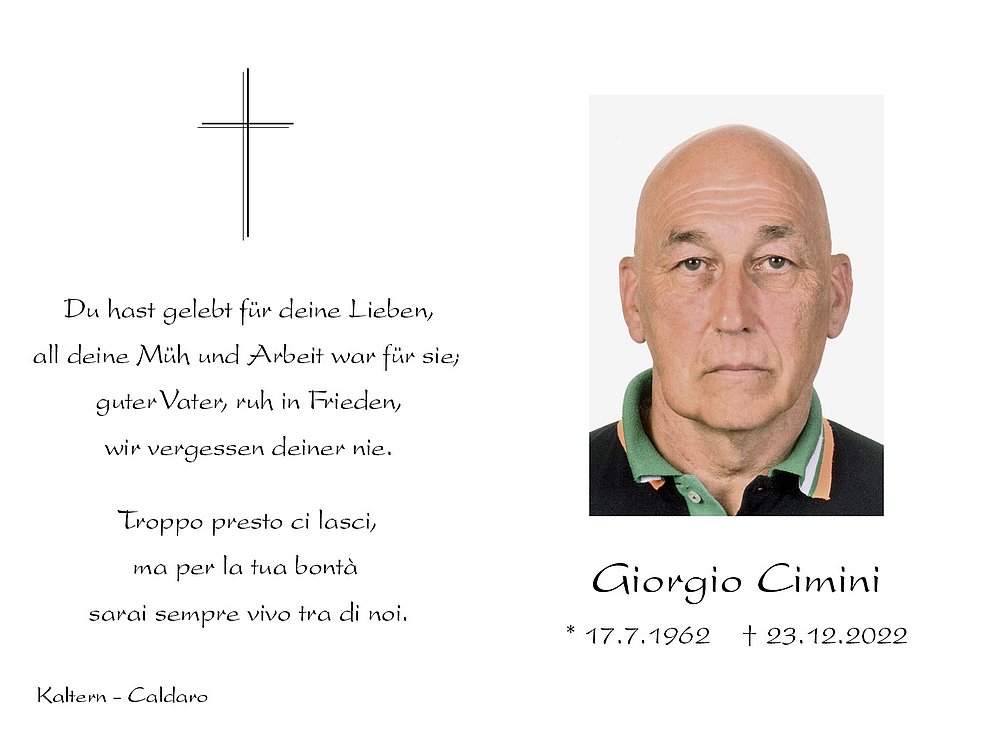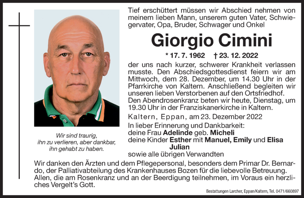 Den Abschiedsgottesdienst feiern wir am Mittwoch, dem 28. Dezember um 14.30 Uhr in der Pfarrkirche von Kaltern. Anschließend begleiten wir unseren lieben Verstorbenen auf den Ortsfriedhof.