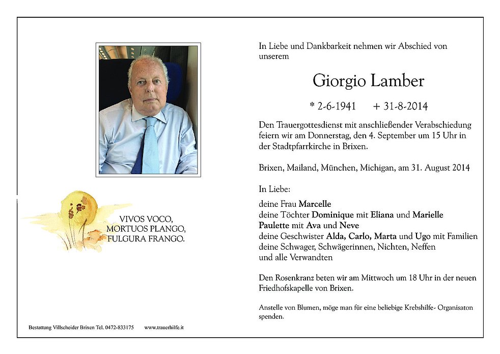 Den Trauergottesdienst mit anschließender Verabschiedung feiern wir am Donnerstag, den 4. September um 15 Uhr in der Stadtpfarrkirche in Brixen.
