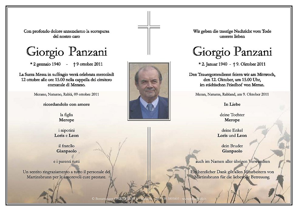 La Santa Messa in suffragio verrà celebrata mercoledì 12 ottobre alle ore 15.00 nella cappella del cimitero comunale di Merano.