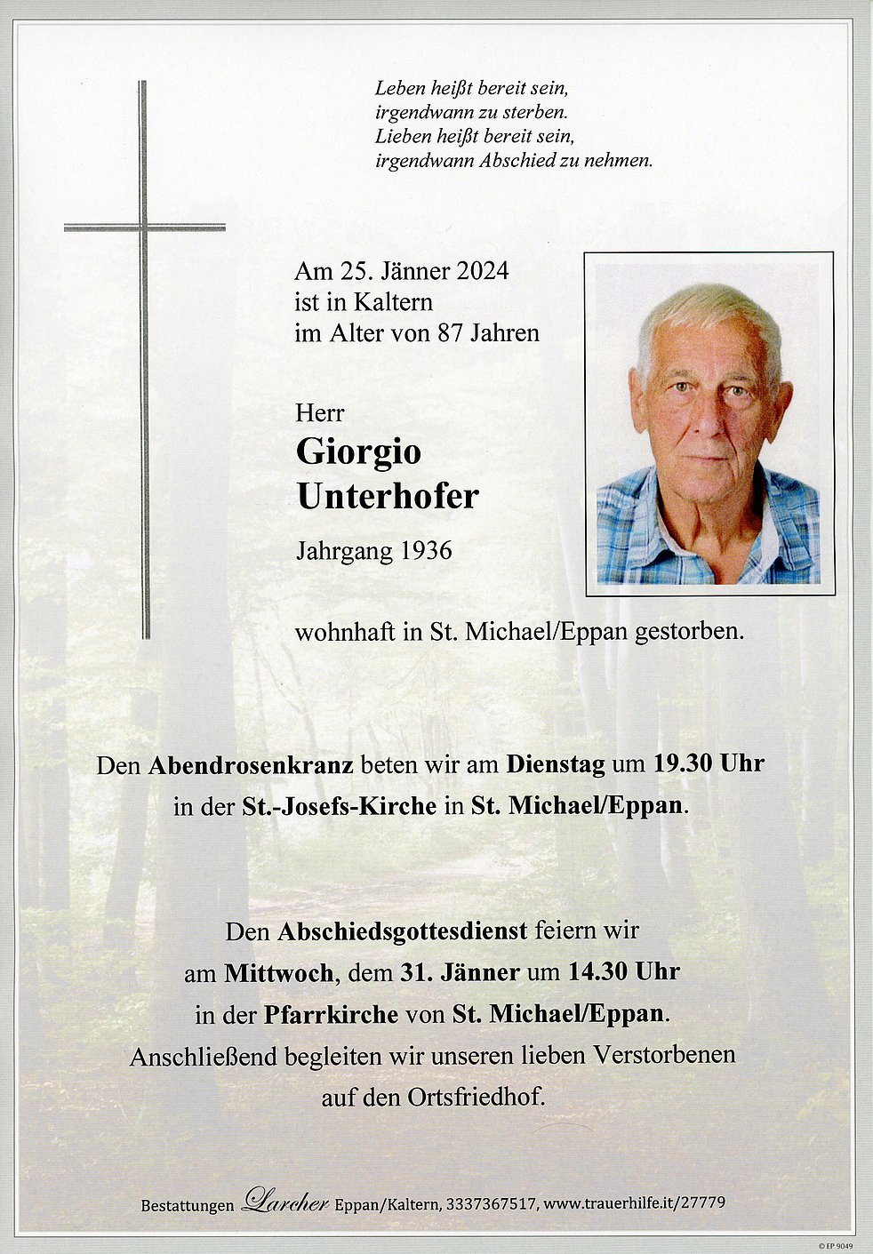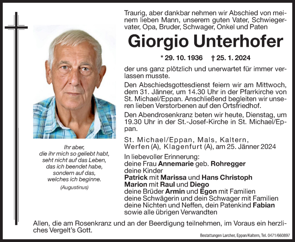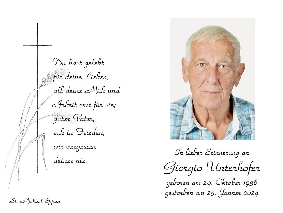 Den Abschiedsgottesdienst feiern wir am Mittwoch, dem 31. Jänner um 14.30 Uhr in der Pfarrkirche von St. Michael Eppan. Anschließend begleiten wir unseren lieben Verstorbenen auf den Ortsfriedhof.