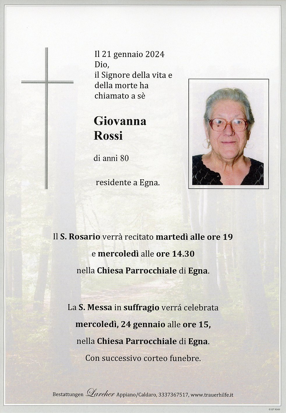 La S. Messa in suffraggio verrà celebrata mercoledì 24 gennaio alle ore 15 nella Chiesa Parrocchiale di Egna. Con successivo corteo funebre.