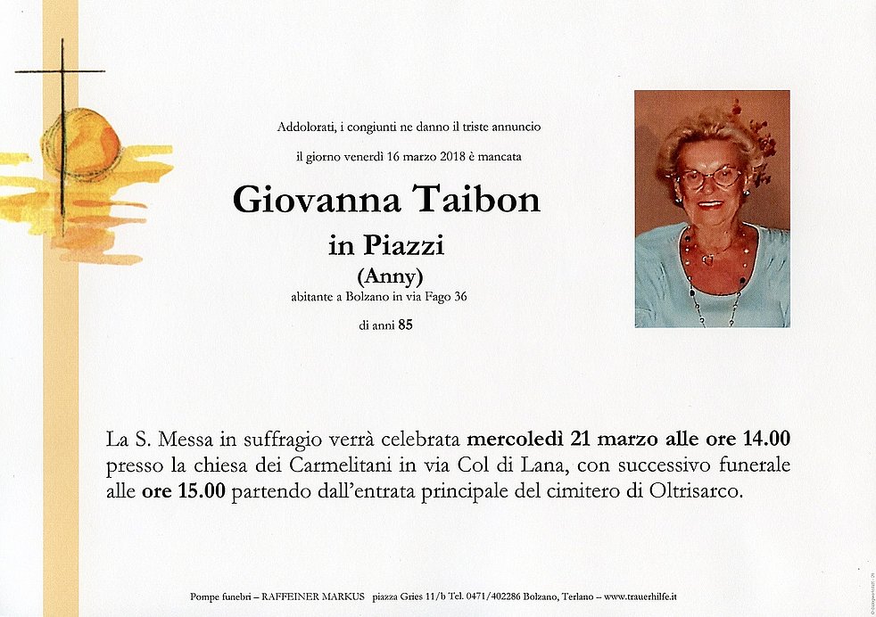 La S. Messa in suffragio verrà celebrata mercoledì 21 marzo alle ore 14.00 presso la chiesa dei Carmelitani in via Col di Lana, con successivo funerale alle ore 15.00 partendo dall’entrata principale del cimitero di Oltrisarco.