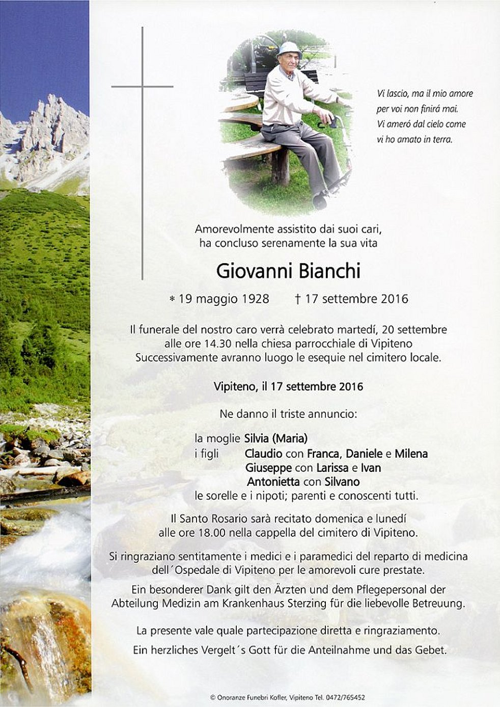 Il funerale del nostro caro verrà celebrato martedí, 20 settembre alle ore 14.30 nella chiesa parrocchiale di Vipiteno. Successivamente avranno luogo le esequie nel cimitero locale.