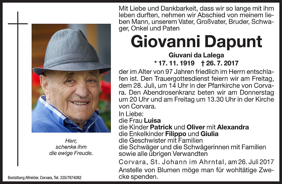 Den Trauergottesdienst feiern wir am Freitag, dem 28. Juli um 14.00 Uhr in der Pfarrkirche von Corvara.