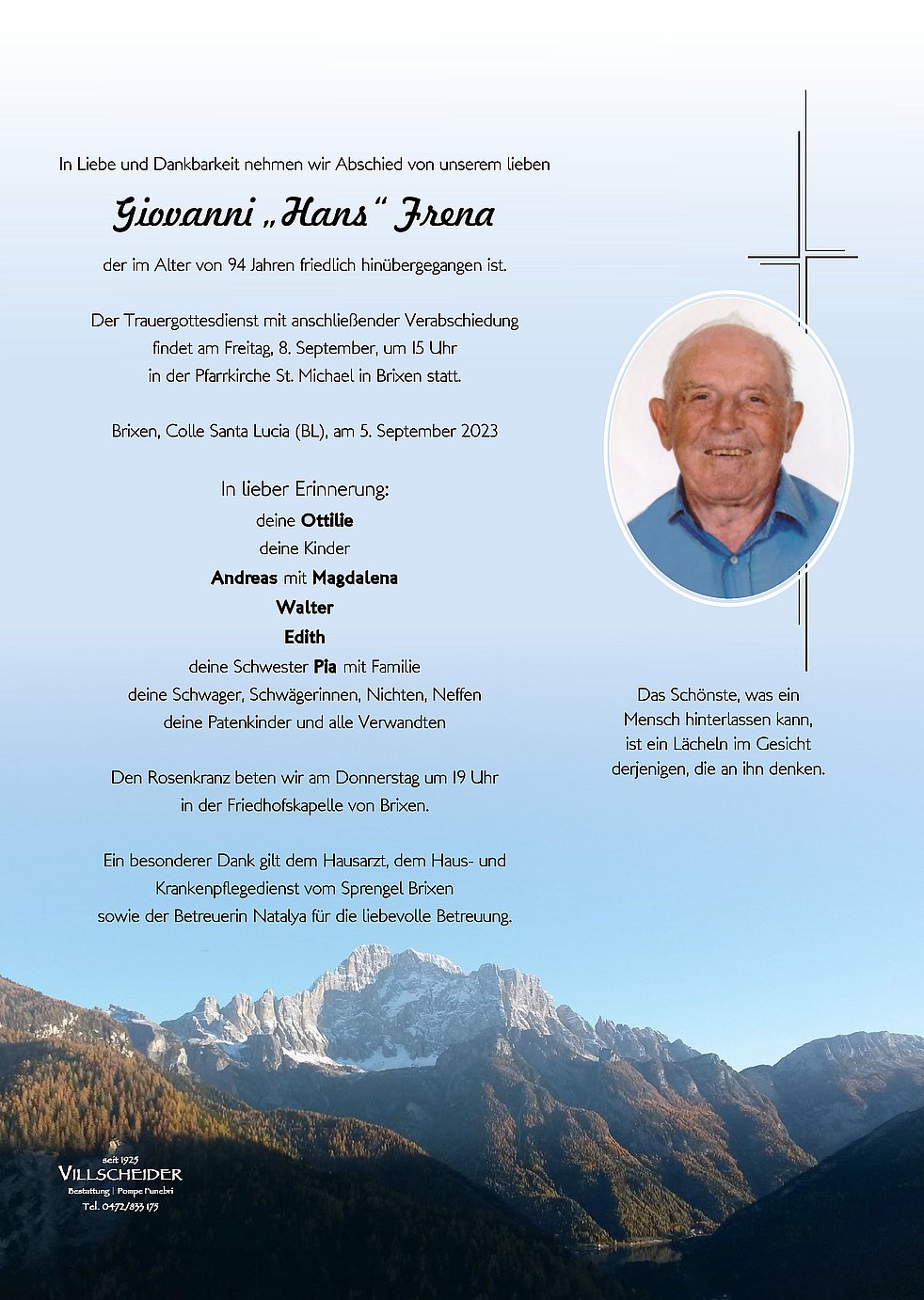 Begräbnisgottesdienst: 08.09. - 15:00 Uhr Brixen