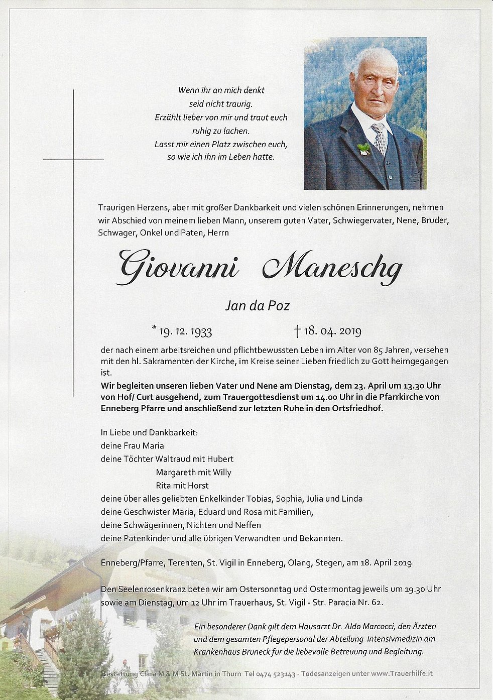 Wir begleiten unseren lieben Vater und Nene am Dienstag, dem 23. April um 13.30 Uhr von Hof/ Curt ausgehend, zum Trauergottesdienst um 14.00 Uhr in die Pfarrkirche von Enneberg Pfarre und anschließend zur letzten Ruhe in den Ortsfriedhof.