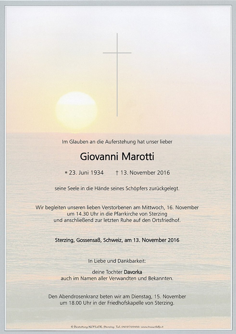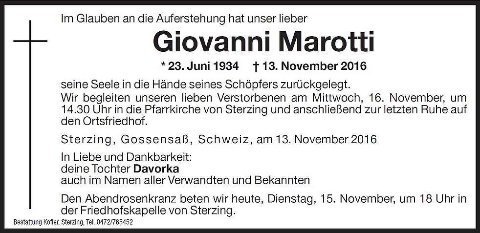 Wir begleiten unseren lieben Verstorbenen am Mittwoch, 16. November um 14.30 Uhr in die Pfarrkirche von Sterzing und anschließend zur letzten Ruhe auf den Ortsfriedhof.