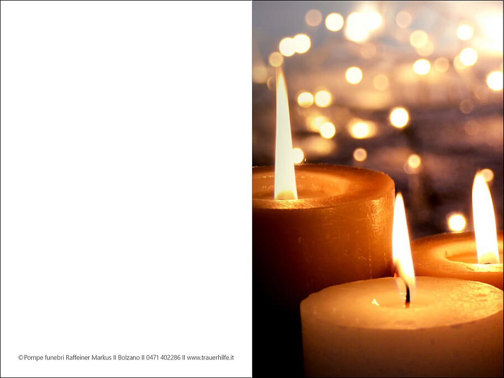 La S. Messa in suffragio verrà celebrata venerdì 3 gennaio alle ore 14.30 nella chiesa parrocchiale di San Pio X a Bolzano, seguirà la cremazione.