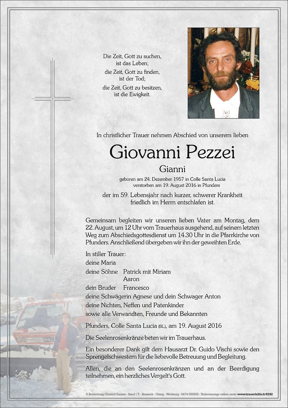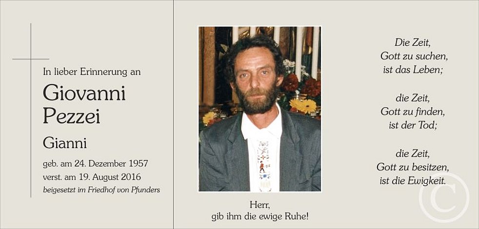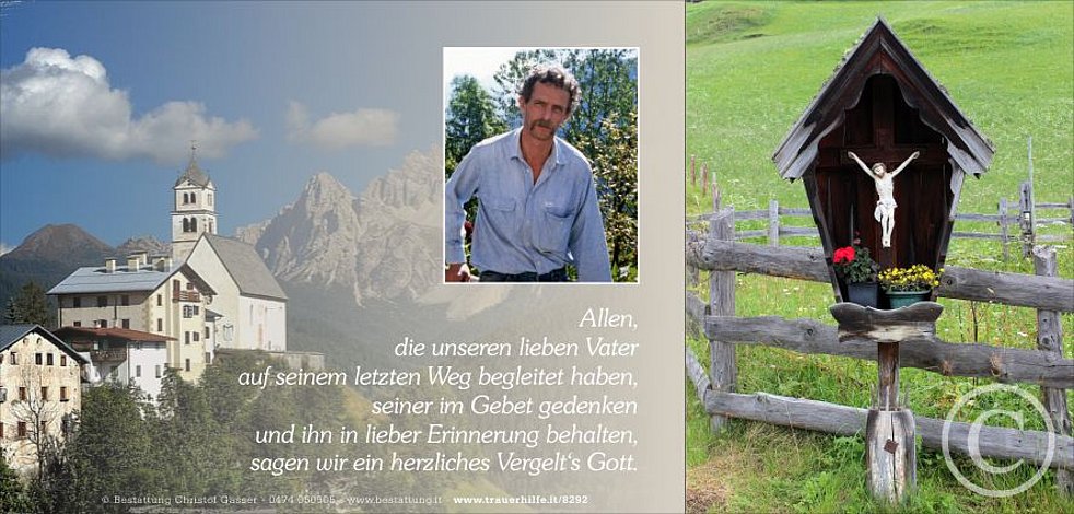 Gemeinsam begleiten wir unseren lieben Vater am Montag, dem 22. August, um 12 Uhr vom Trauerhaus ausgehend, auf seinem letzten Weg zum Abschiedsgottesdienst um 14.30 Uhr in die Pfarrkirche von Pfunders. Anschließend übergeben wir ihn der geweihten Erde.