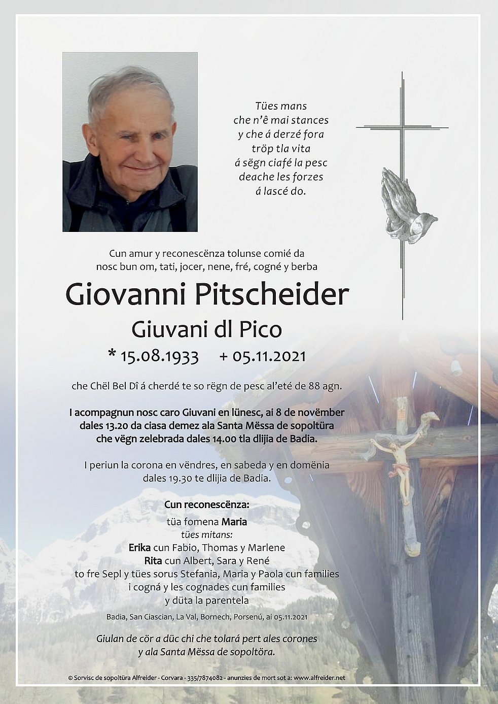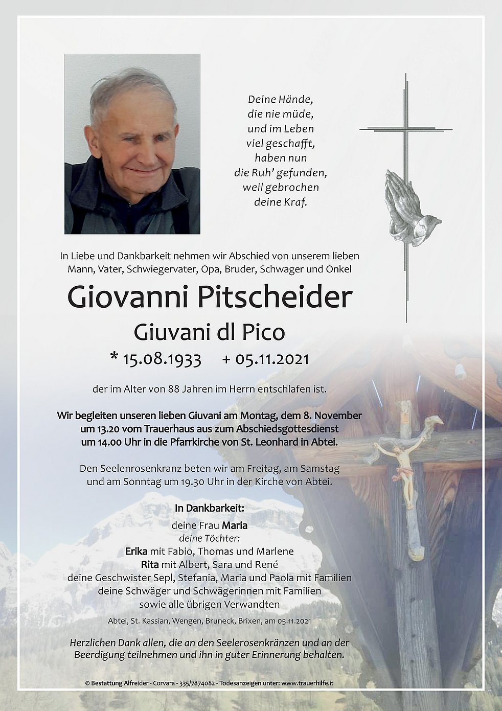 Wir begleiten unseren lieben Giuvani am Montag, dem 8. November um 13.20 vom Trauerhaus aus zum Abschiedsgottesdienst um 14.00 Uhr in die Pfarrkirche von St. Leonhard in Abtei.