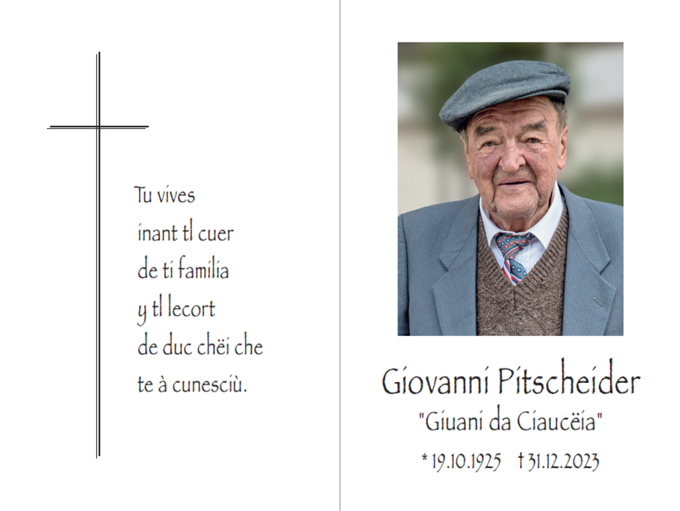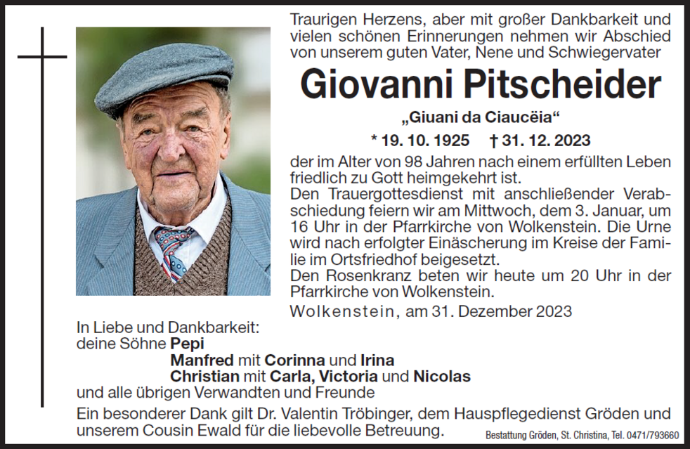 Den Trauergottesdienst mit anschließender Verabschiedung feiern wir am Mittwoch, dem 3. Januar, um 16.00 Uhr in der Pfarrkirche von Wolkenstein. Die Urne wird nach erfolgter Einäscherung im Kreise der Familie im Ortsfriedhof beigesetzt.