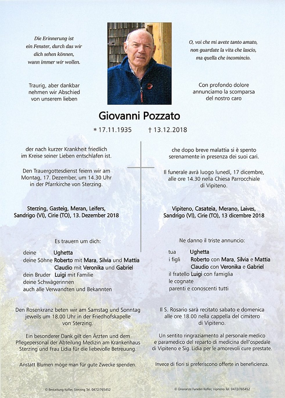 Den Trauergottesdienst feiern wir am Montag, 17. Dezember, um 14.30 Uhr in der Pfarrkirche von Sterzing.
