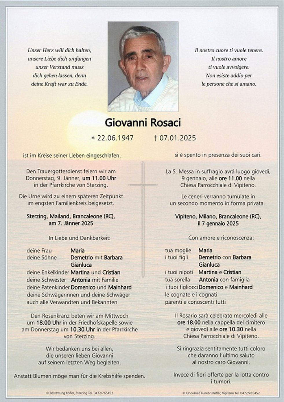 La S. Messa in suffragio avrá luogo giovedì, 9 gennaio, alle ore 11.00 nella Chiesa Parrocchiale di Vipiteno.