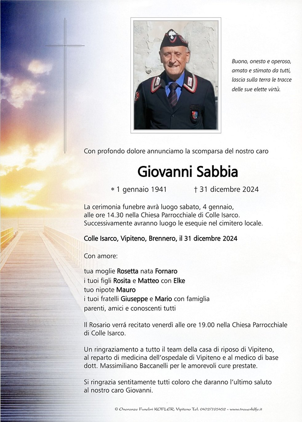 La cerimonia funebre avrà luogo sabato, 4 gennaio, alle ore 14.30 nella Chiesa Parrocchiale di Colle Isarco. Successivamente avranno luogo le esequie nel cimitero locale.