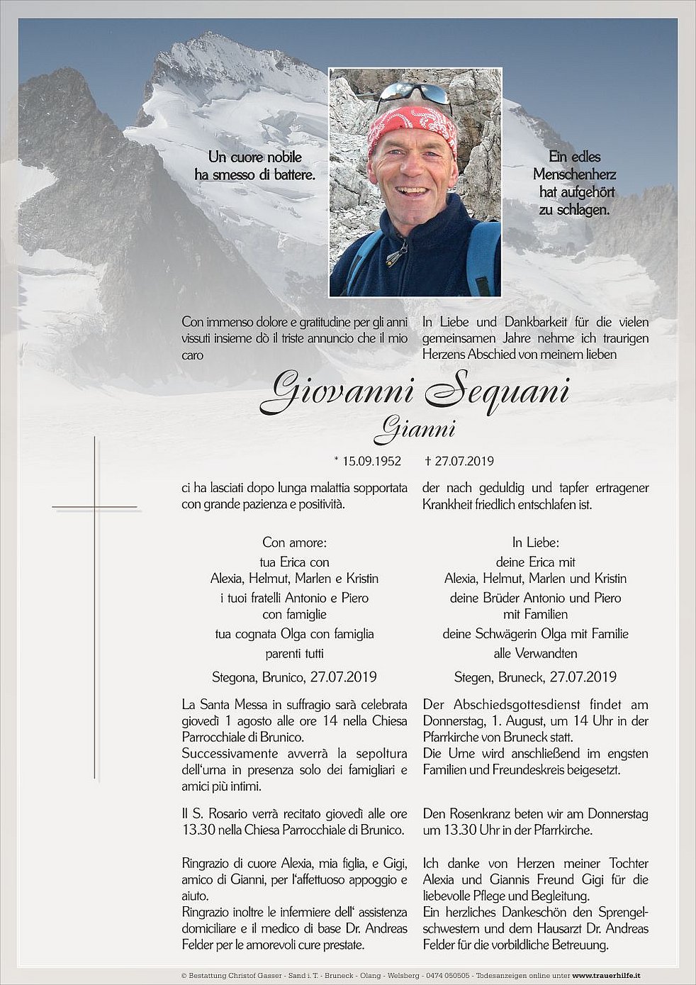 Der Abschiedsgottesdienst findet am Donnerstag, 1. August, um 14 Uhr in der Pfarrkirche von Bruneck statt.