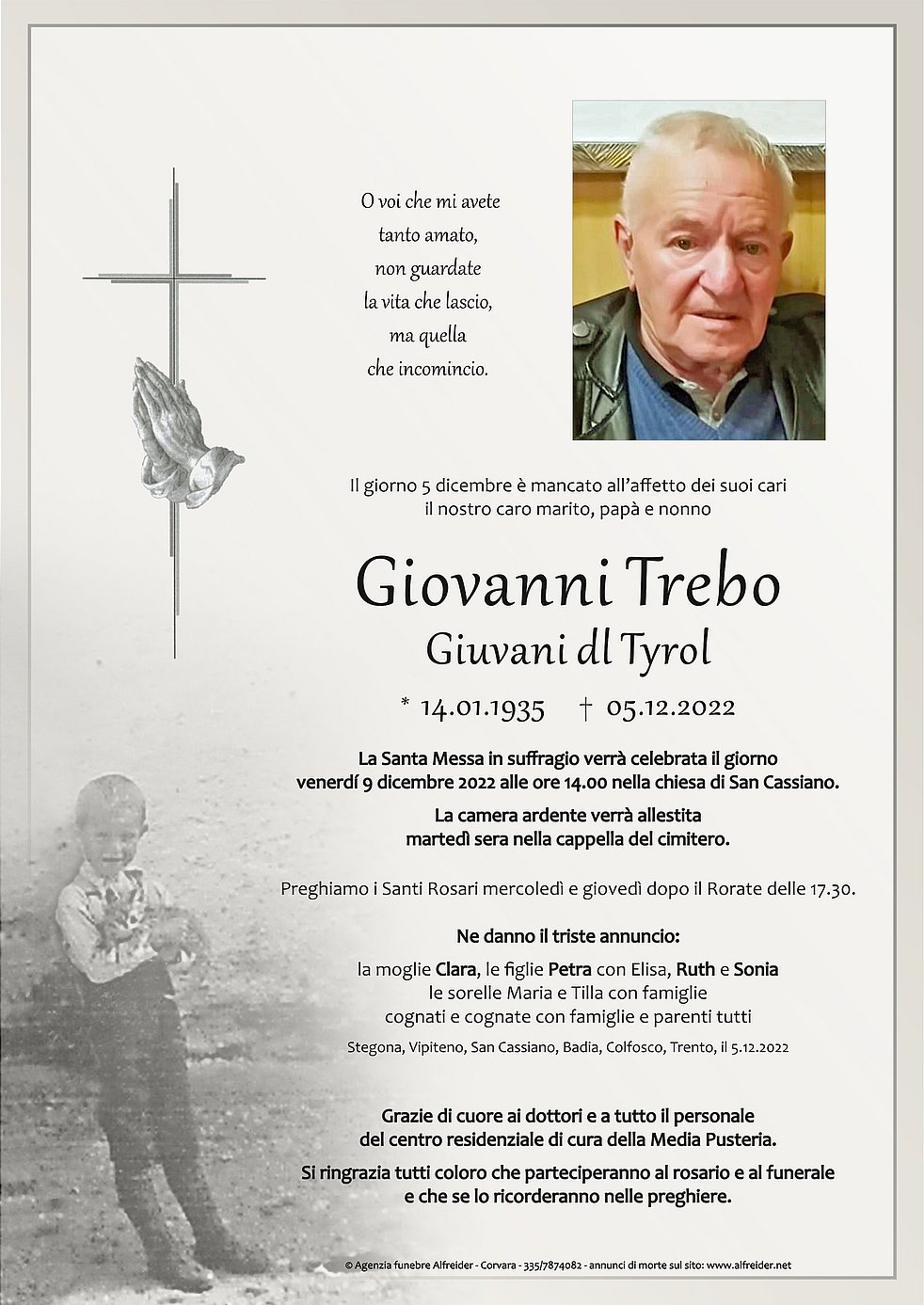 La Santa Messa in suffragio verrà celebrata il giorno venerdí 9 dicembre 2022 alle ore 14.00 nella chiesa di San Cassiano.