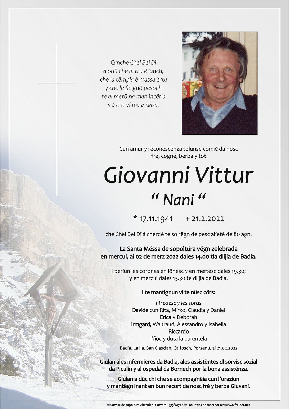 Den Trauergottesdienst feiern wir am Mittwoch, dem 2. März, um 14.00 Uhr in der Pfarrkirche von St. Leonhard in Abtei.
