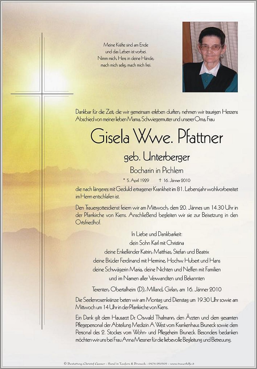 Den Trauergottesdienst feiern wir am Mittwoch, dem 20. Jänner, um 14.30 Uhr in der Pfarrkirche von Kiens. Anschließend begleiten wir sie zur Beisetzung in den Ortsfriedhof.