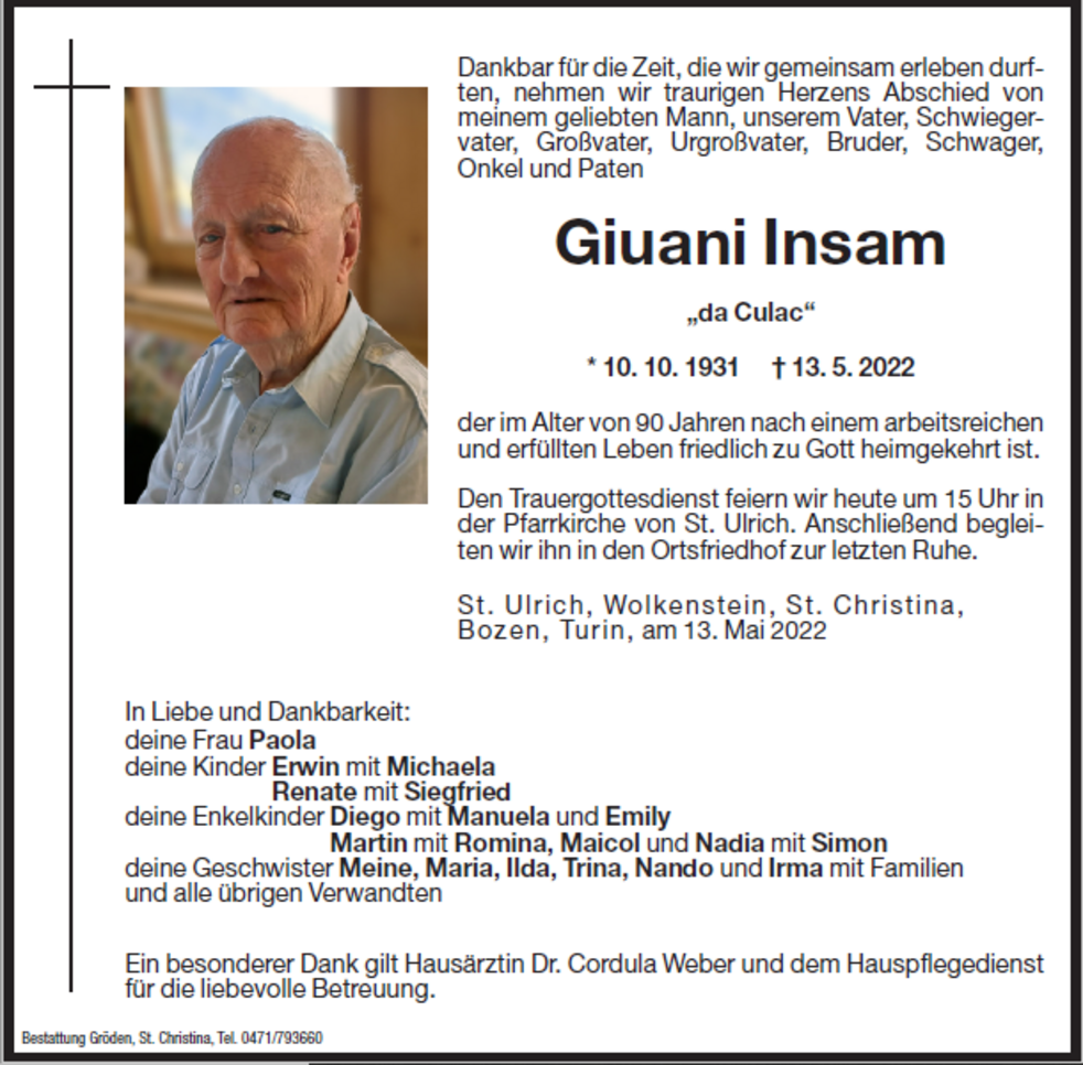 Den Trauergottesdienst feiern wir am Samstag, dem 14. Mai, um 15 Uhr in der Pfarrkirche von St. Ulrich. Anschließend begleiten wir ihn in den Ortsfriedhof zur letzten Ruhe.