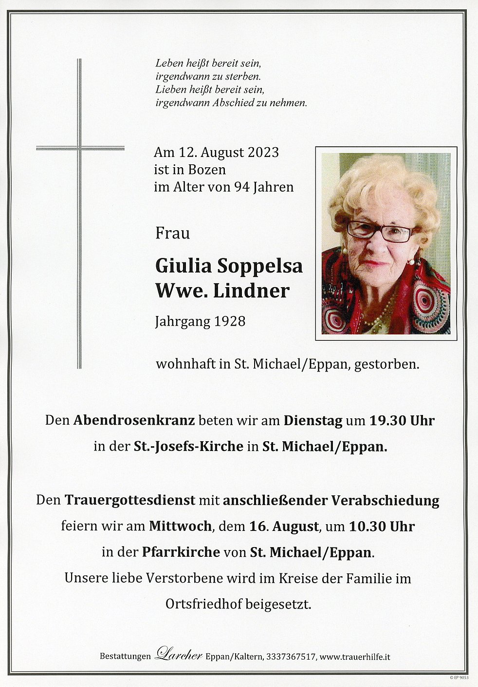 Den Trauergottesdienst mit anschließender Verabschiedung feiern wir am Mittwoch, dem 16. August, um 10.30 Uhr in der Pfarrkirche von St. Michael/Eppan.