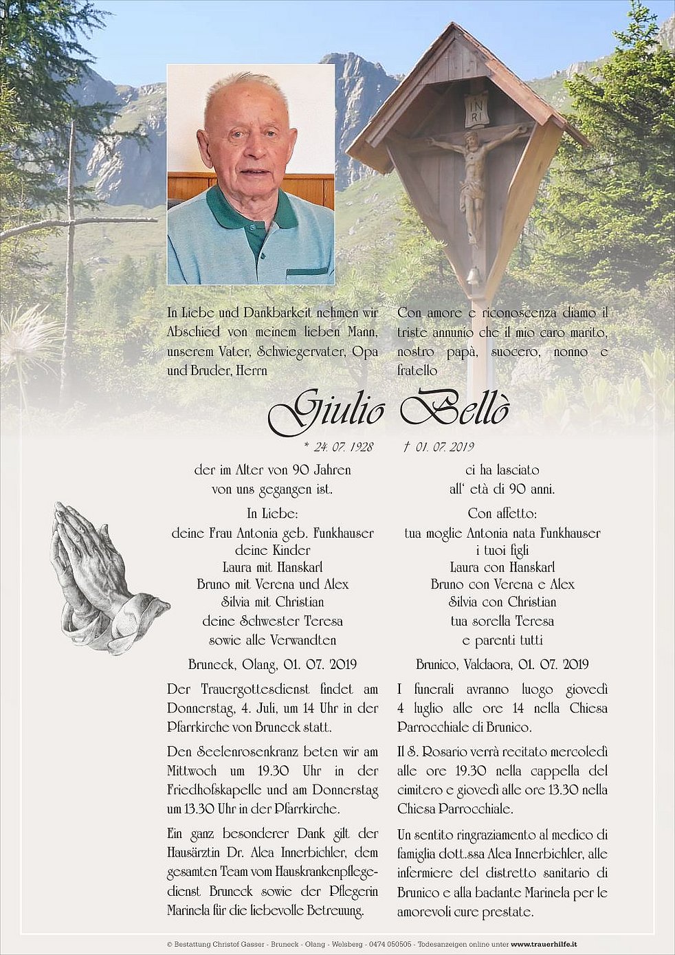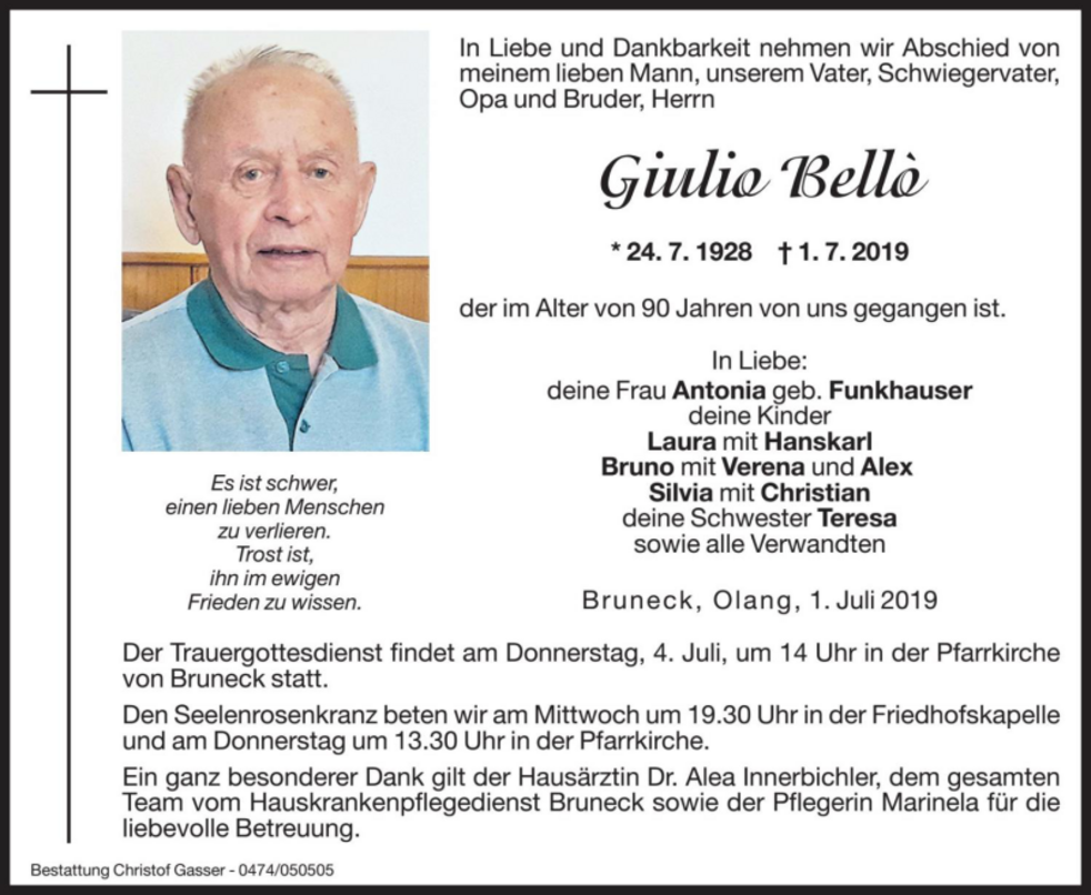 Der Trauergottesdienst findet am Donnerstag, 4. Juli, um 14 Uhr in der Pfarrkirche von Bruneck statt.
