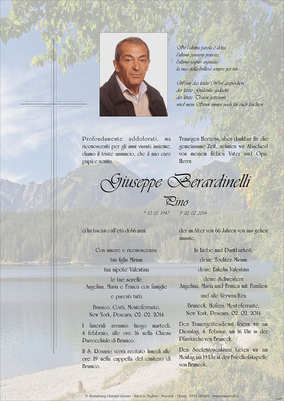 Den Trauergottesdienst feiern wir am Dienstag, 4. Februar, um 16 Uhr in der Pfarrkirche von Bruneck.
