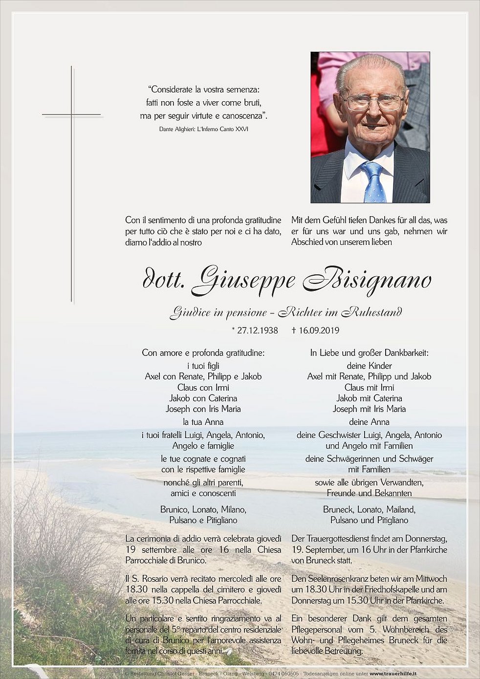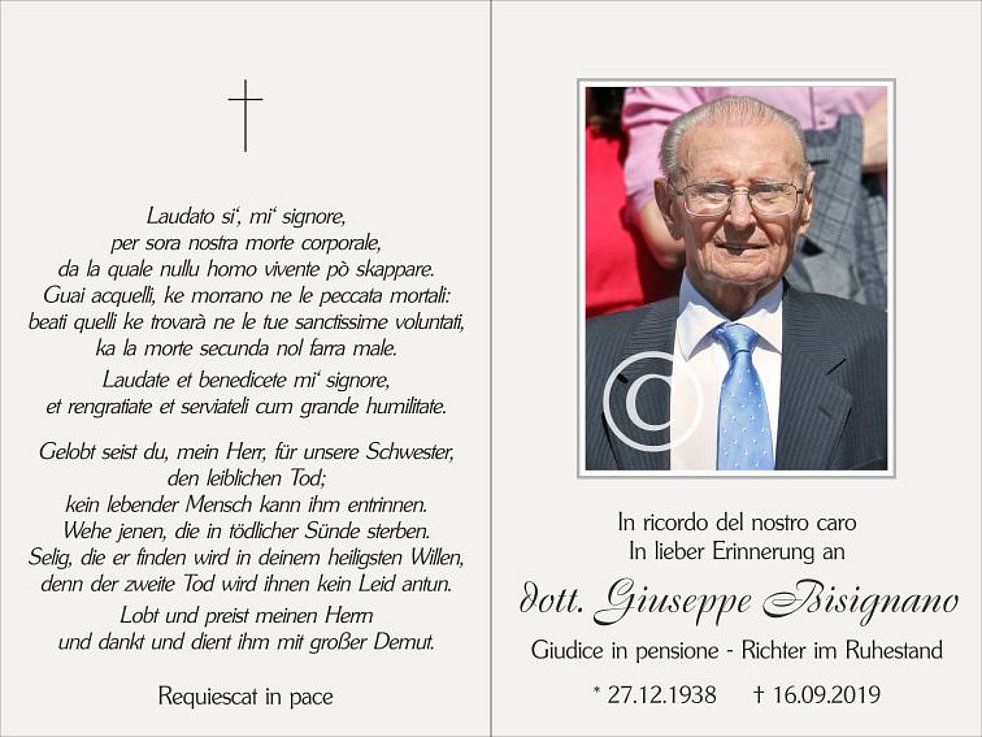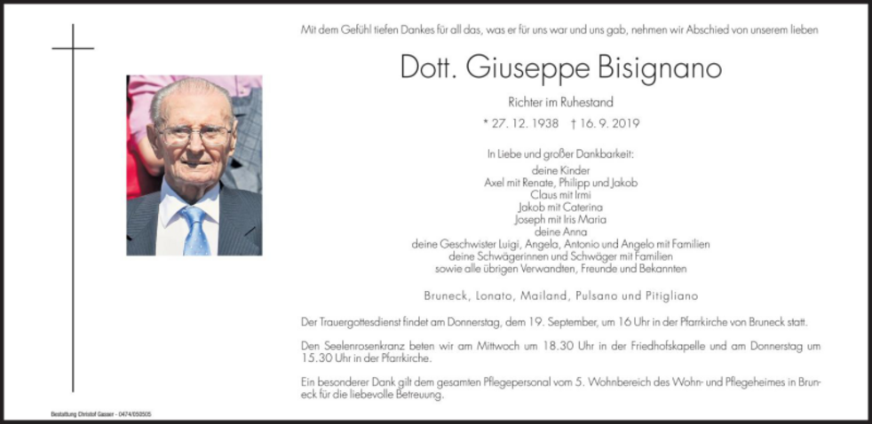 Der Trauergottesdienst findet am Donnerstag, 19. September, um 16 Uhr in der Pfarrkirche von Bruneck statt.