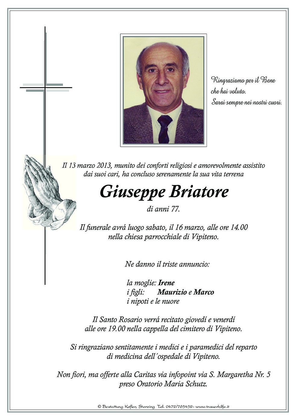 Non fiori, ma offerte alla Caritas via infopoint via S. Margaretha Nr. 5