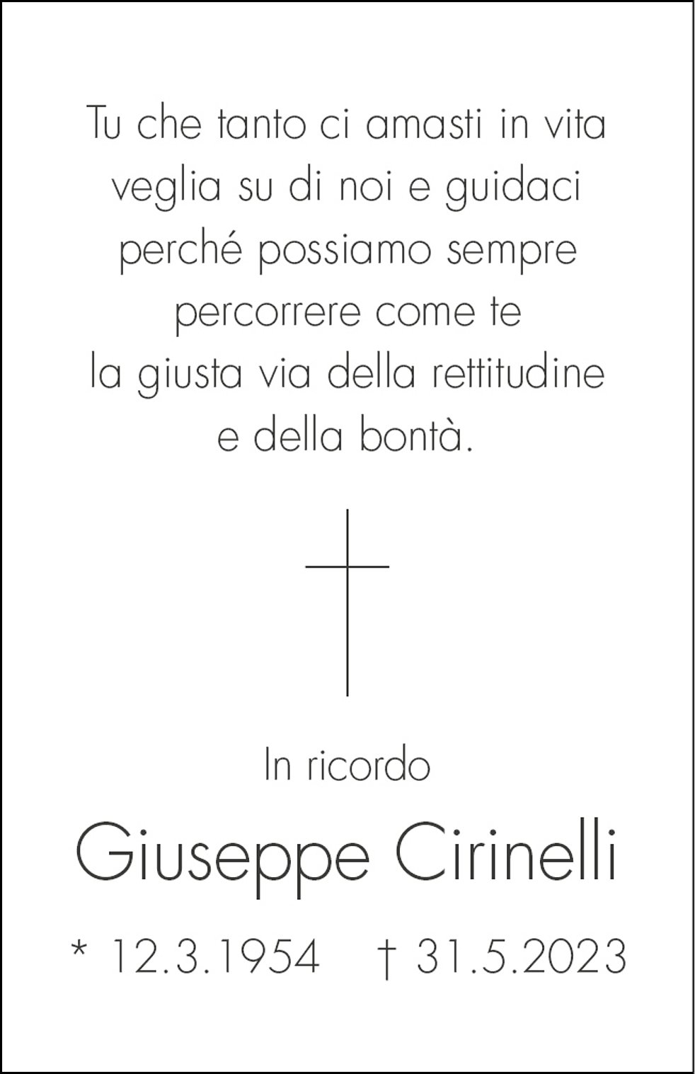 Ne danno il triste annuncio la moglie Maria, i figli Tiziana, Andrea e Silvia, e parenti tutti.