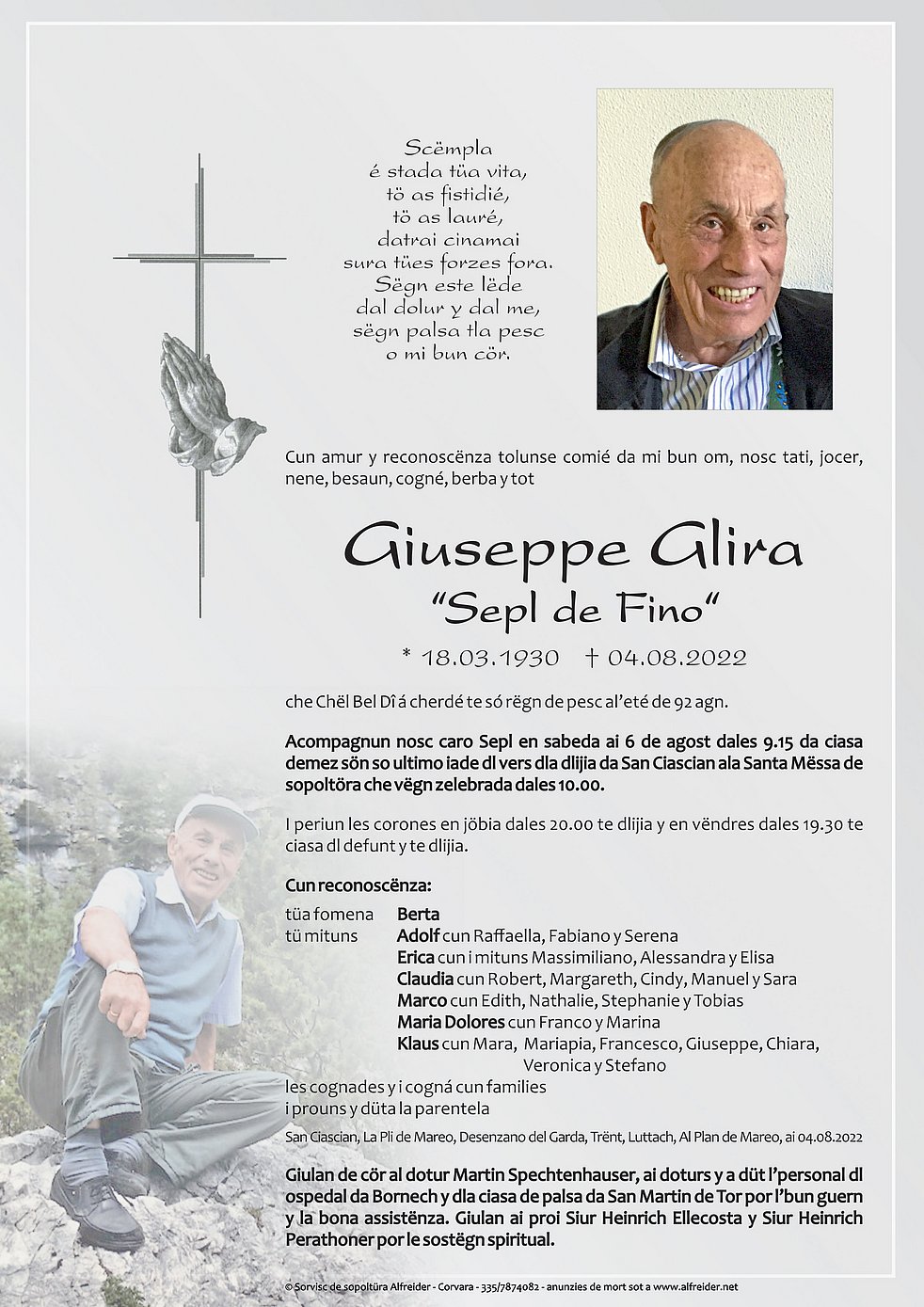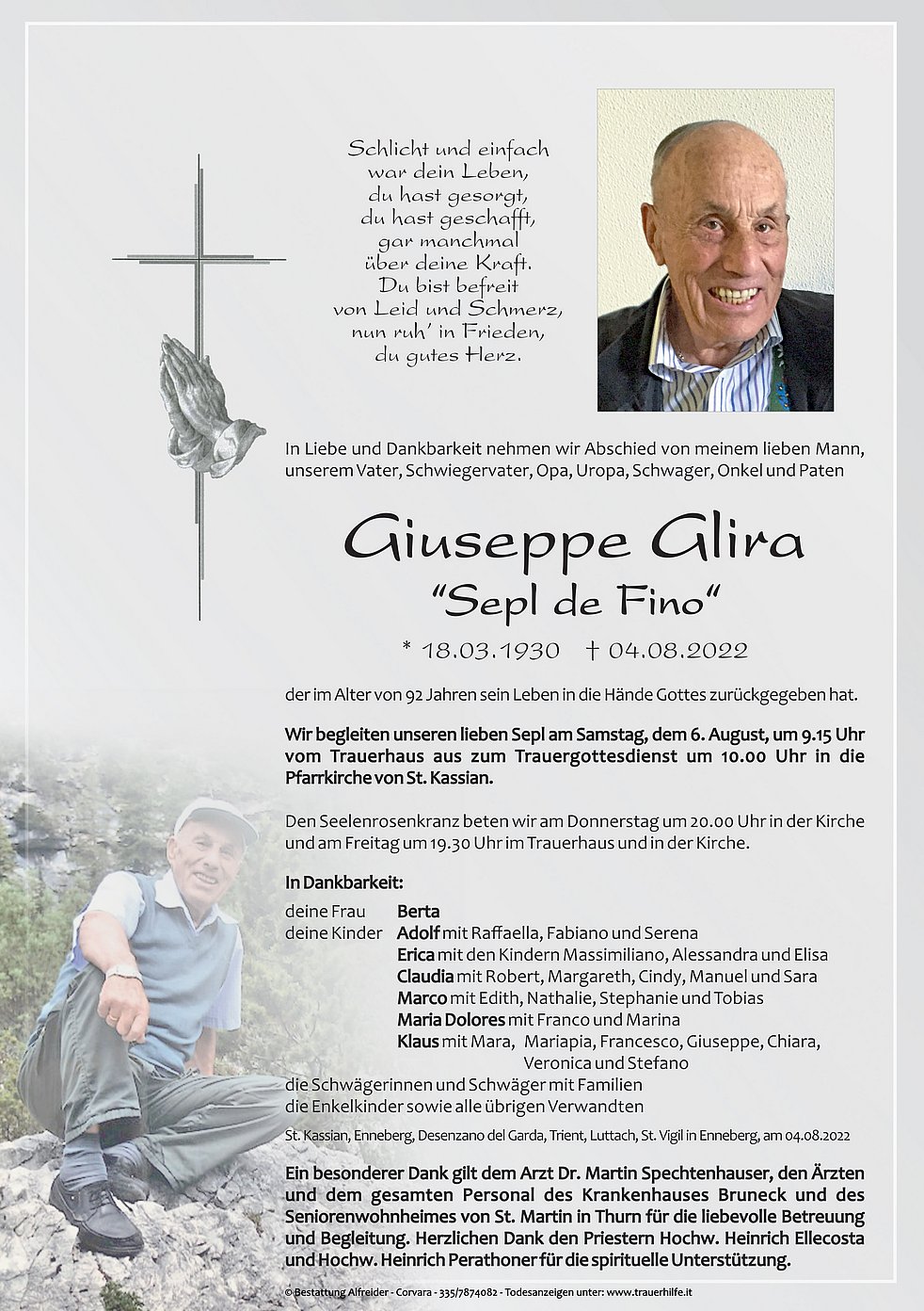 Wir begleiten unseren lieben Sepl am Samstag, dem 6. August, um 9.15 Uhr vom Trauerhaus aus zum Trauergottesdienst um 10.00 Uhr in die Pfarrkirche von St. Kassian.