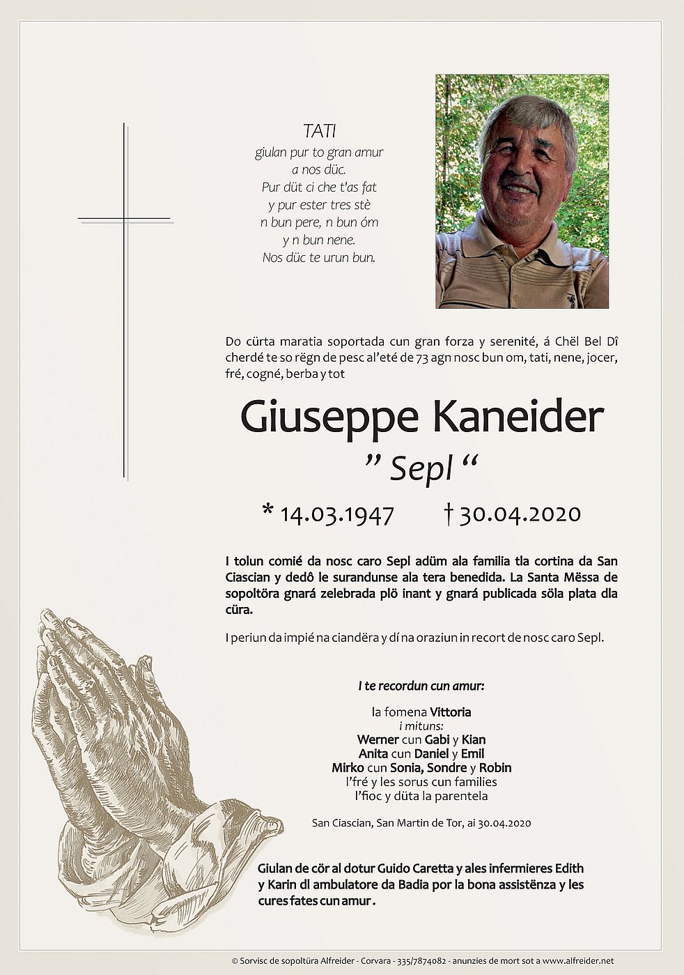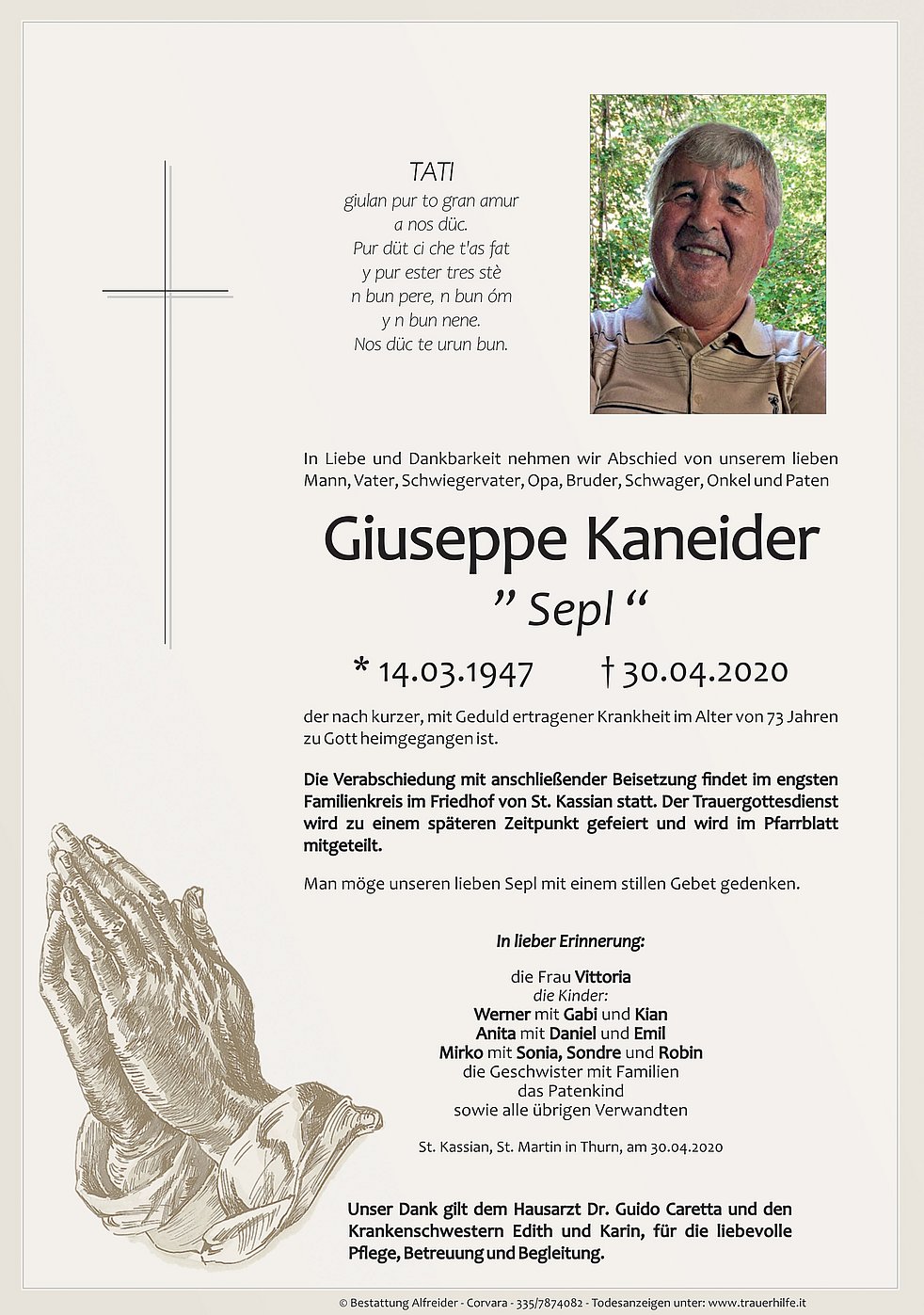 Die Verabschiedung mit anschließender Beisetzung findet im engsten Familienkreis im Friedhof von St. Kassian statt. Der Trauergottesdienst wird zu einem späteren Zeitpunkt gefeiert und wird im Pfarrblatt mitgeteilt.