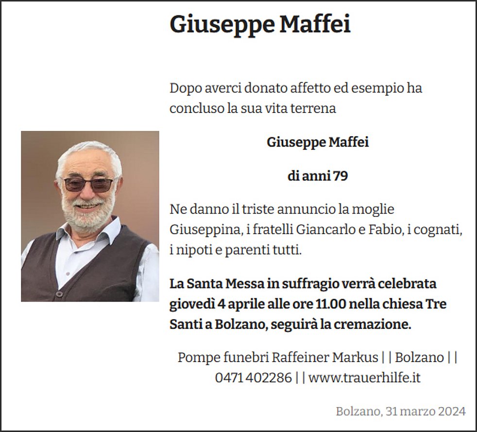 La Santa Messa in suffragio verrà celebrata giovedì 4 aprile alle ore 11.00 nella chiesa Tre Santi a Bolzano, seguirà la cremazione.