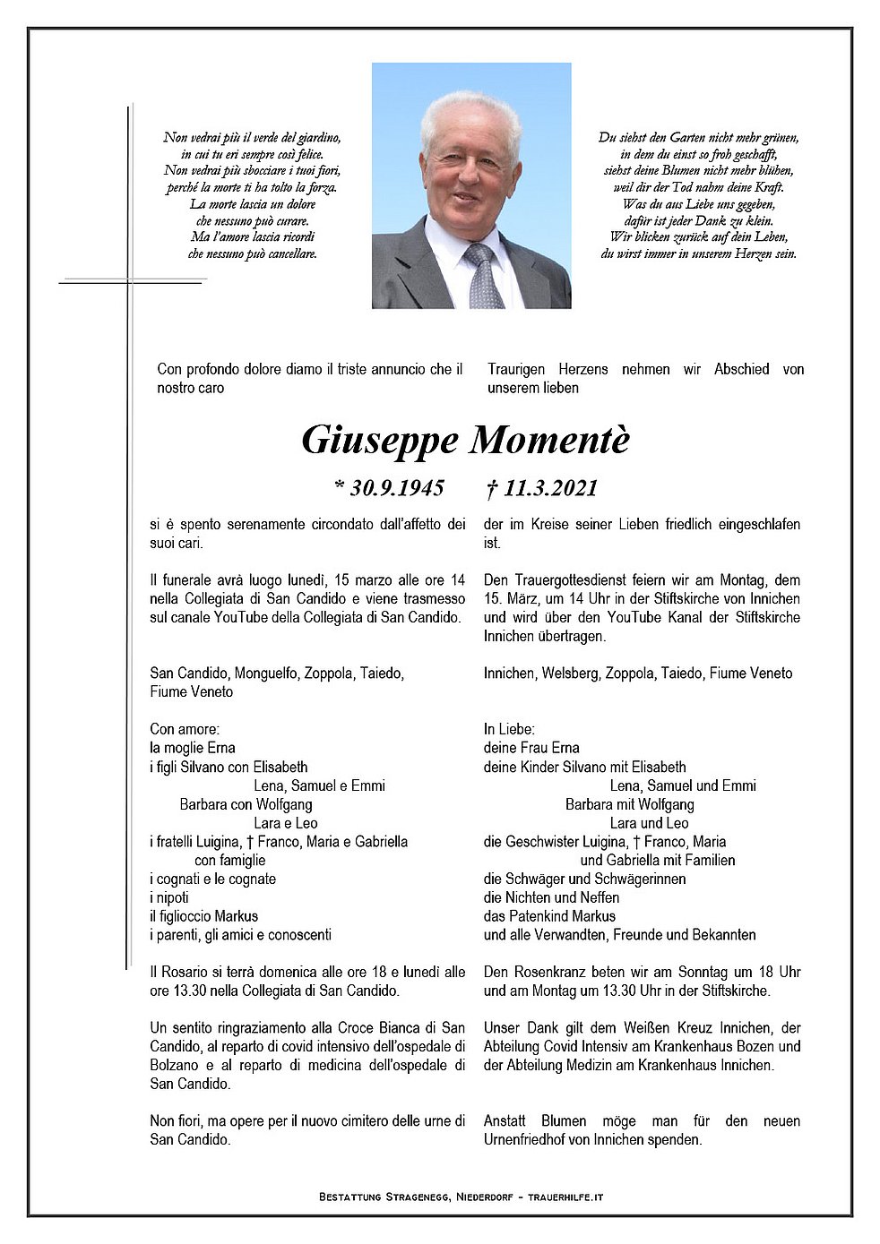 Den Trauergottesdienst feiern wir am Montag, dem 15. März, um 14 Uhr in der Stiftskirche von Innichen und wird über den YouTube Kanal der Stiftskirche Innichen übertragen.