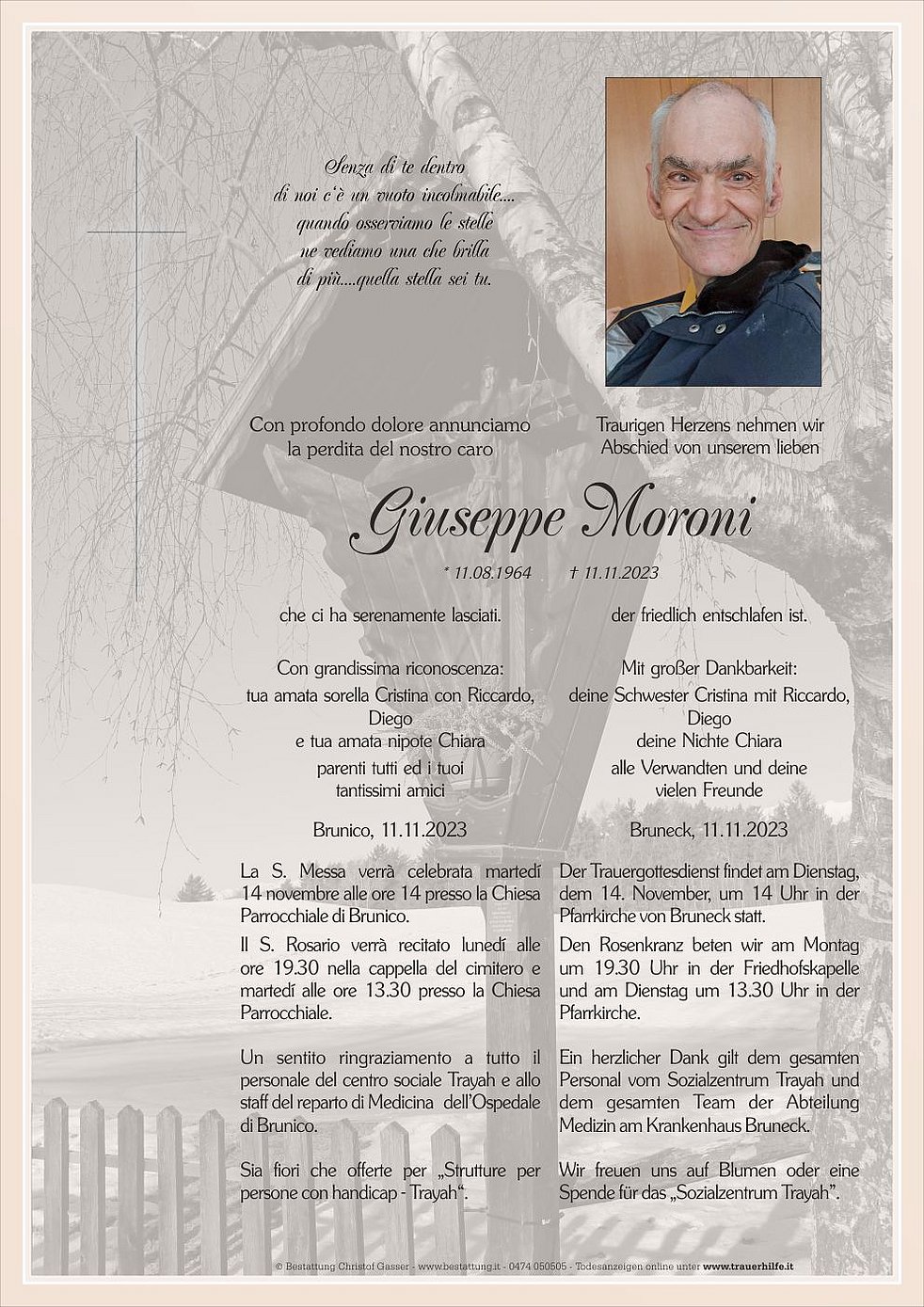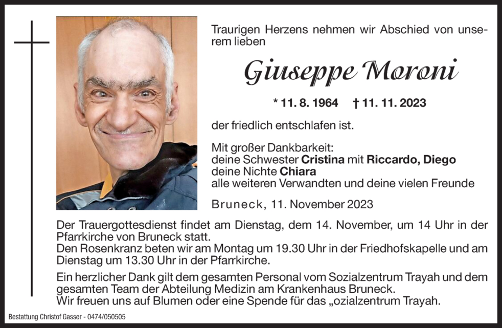 Der Trauergottesdienst findet am Dienstag, dem 14. November, um 14 Uhr in der Pfarrkirche von Bruneck statt.