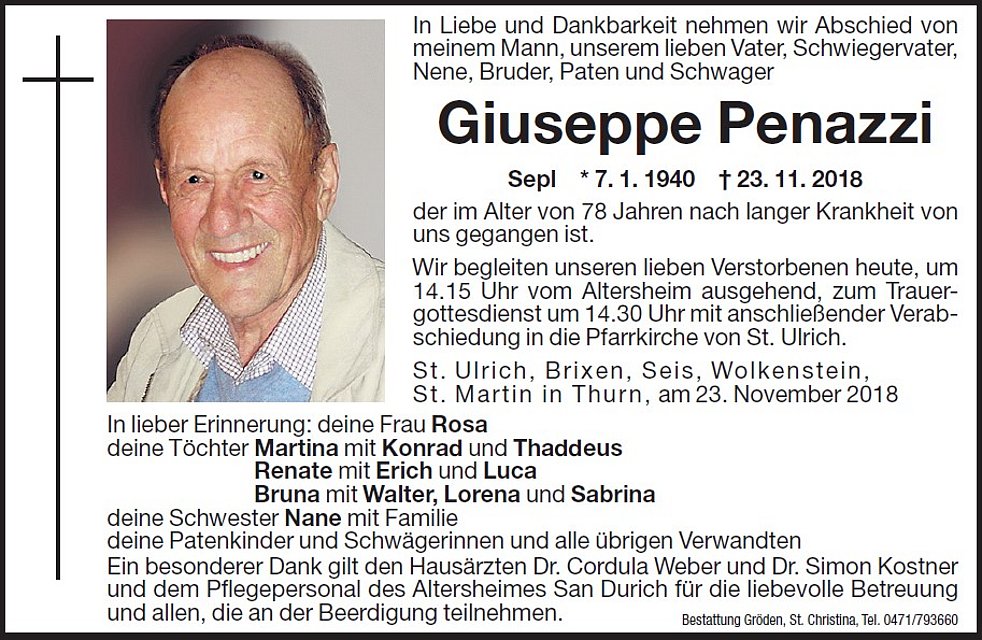 La supeltura ie n lunesc, ai 26 de nuvëmber, dala 14.15 da cësa de paussa San Durich demez. La funzions te dlieja a Urtijëi ie dala 14.30.