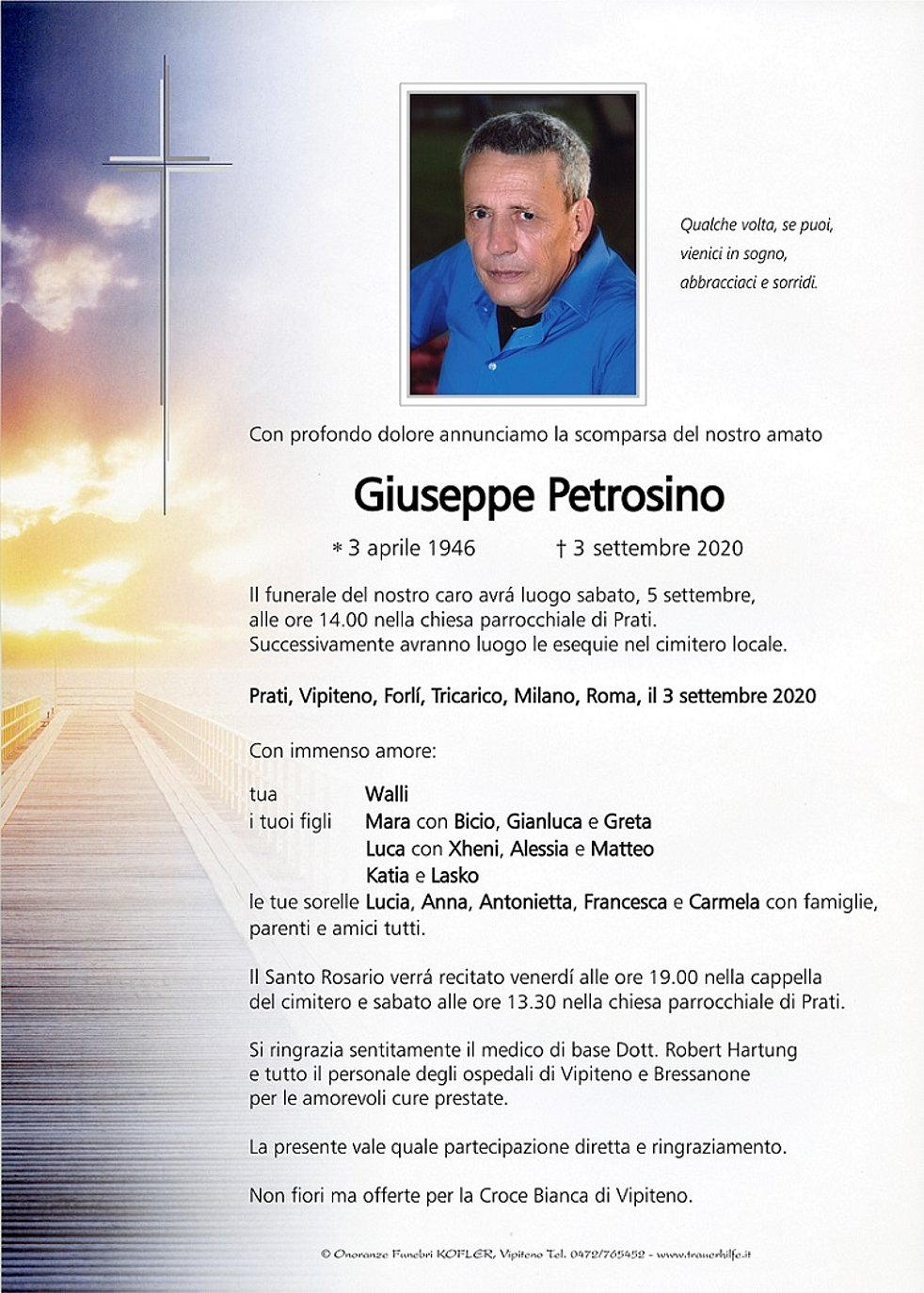 Il funerale del nostro caro avrá luogo sabato, 5 settembre, alle ore 14.00 nella chiesa parrocchiale di Prati.