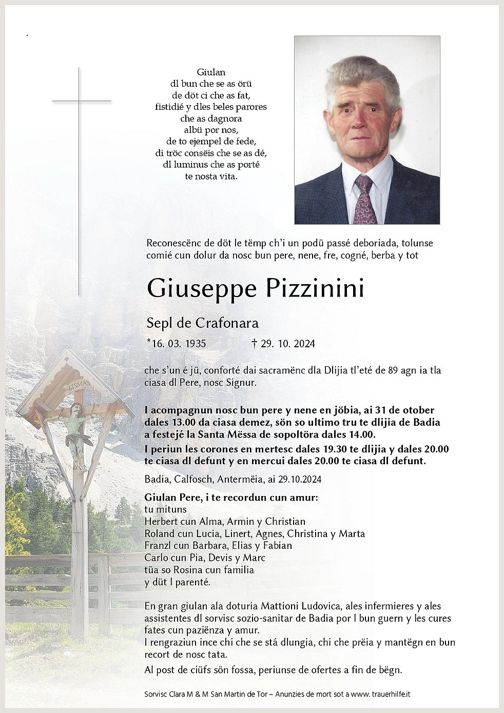 La vita eterna dai o Signur. Condolianzes ai familiars