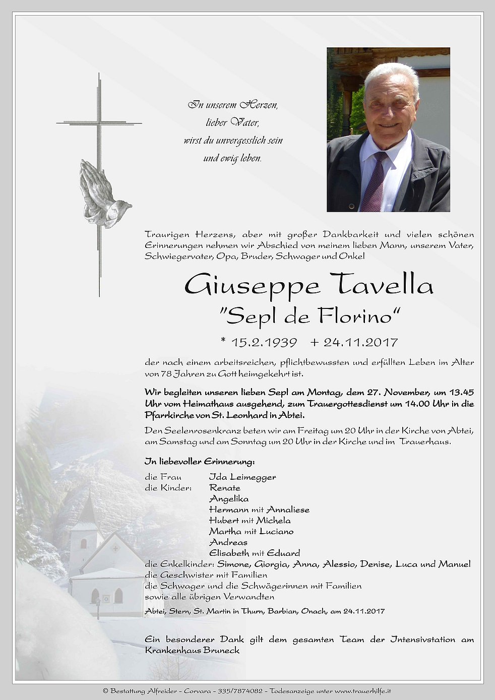 Wir begleiten unseren lieben Sepl am Montag, dem 27. November, um 13.45 Uhr vom Heimathaus ausgehend, zum Trauergottesdienst um 14.00 Uhr in die Pfarrkirche von St. Leonhard in Abtei.