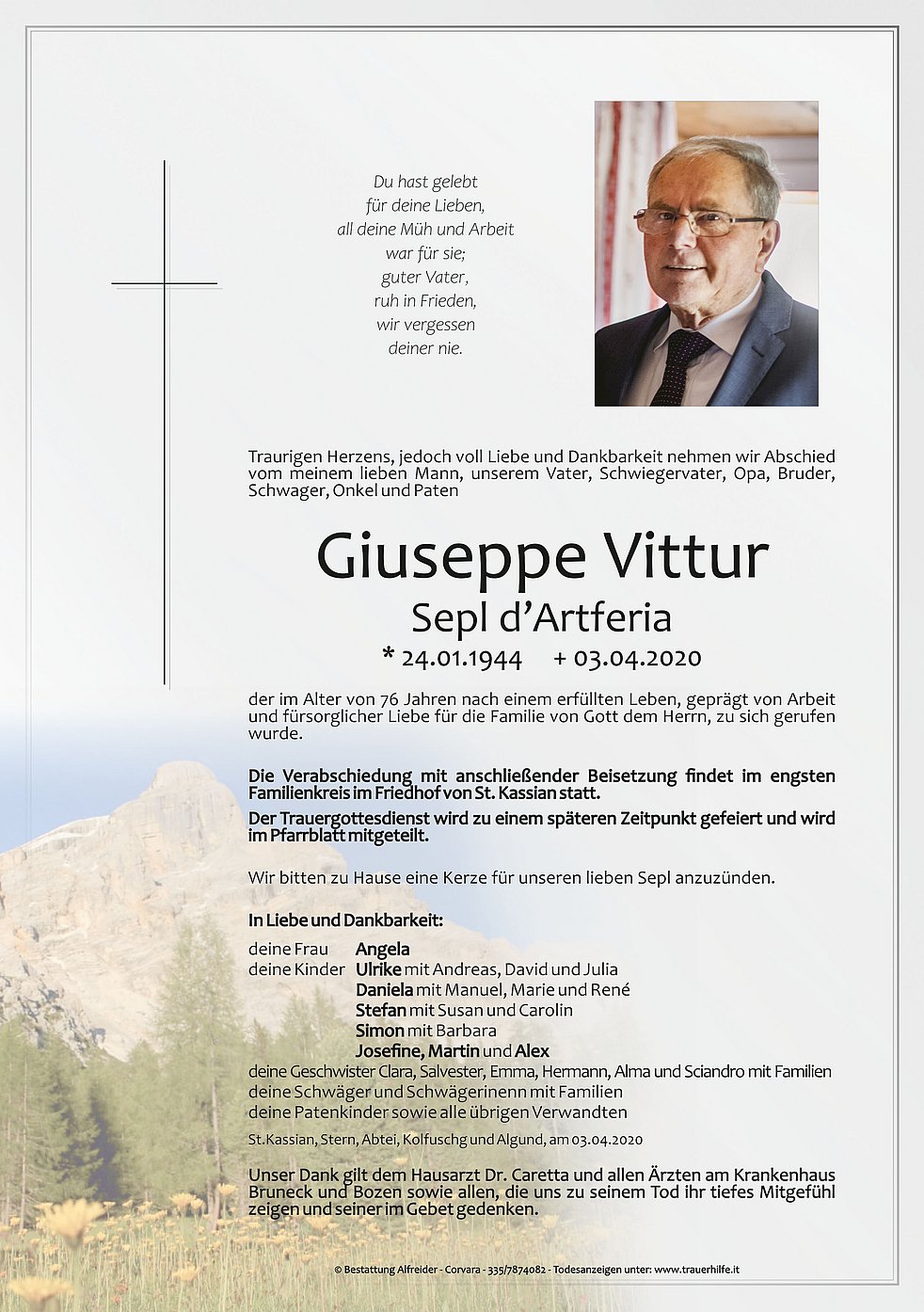 Die Verabschiedung mit anschließender Beisetzung findet im engsten Familienkreis im Friedhof von St. Kassian statt.