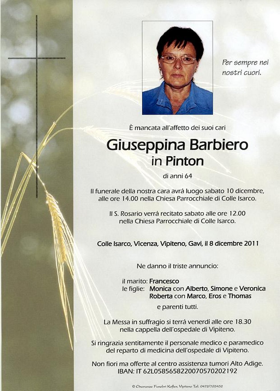 Il funerale della nostra cara avrá luogo sabato 10 dicembre, alle ore 14.00