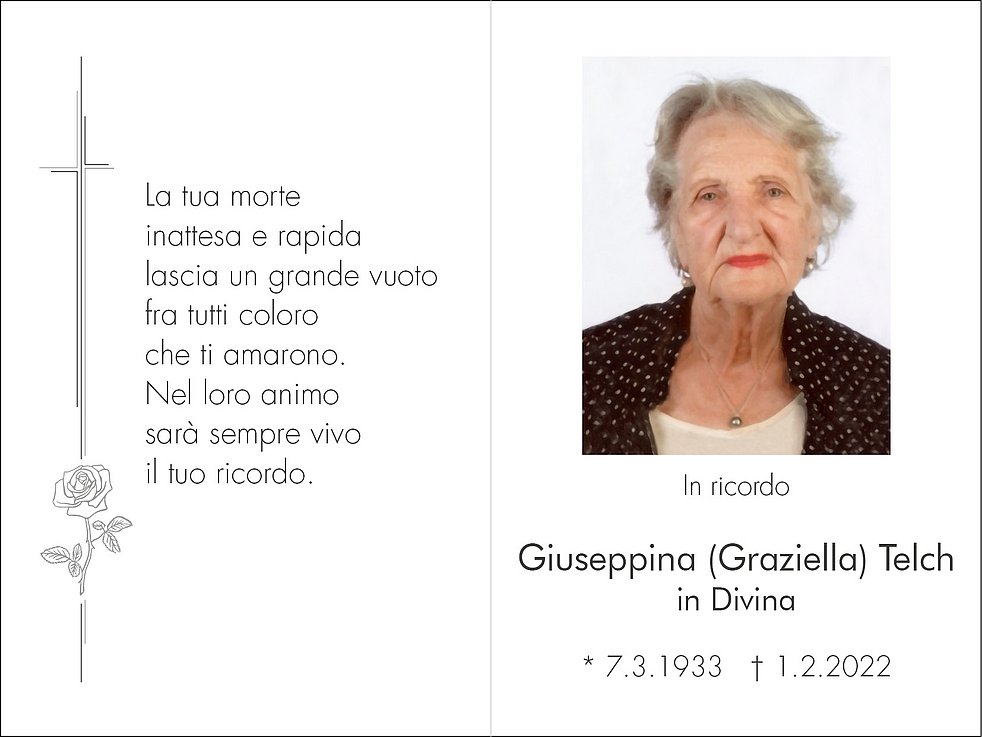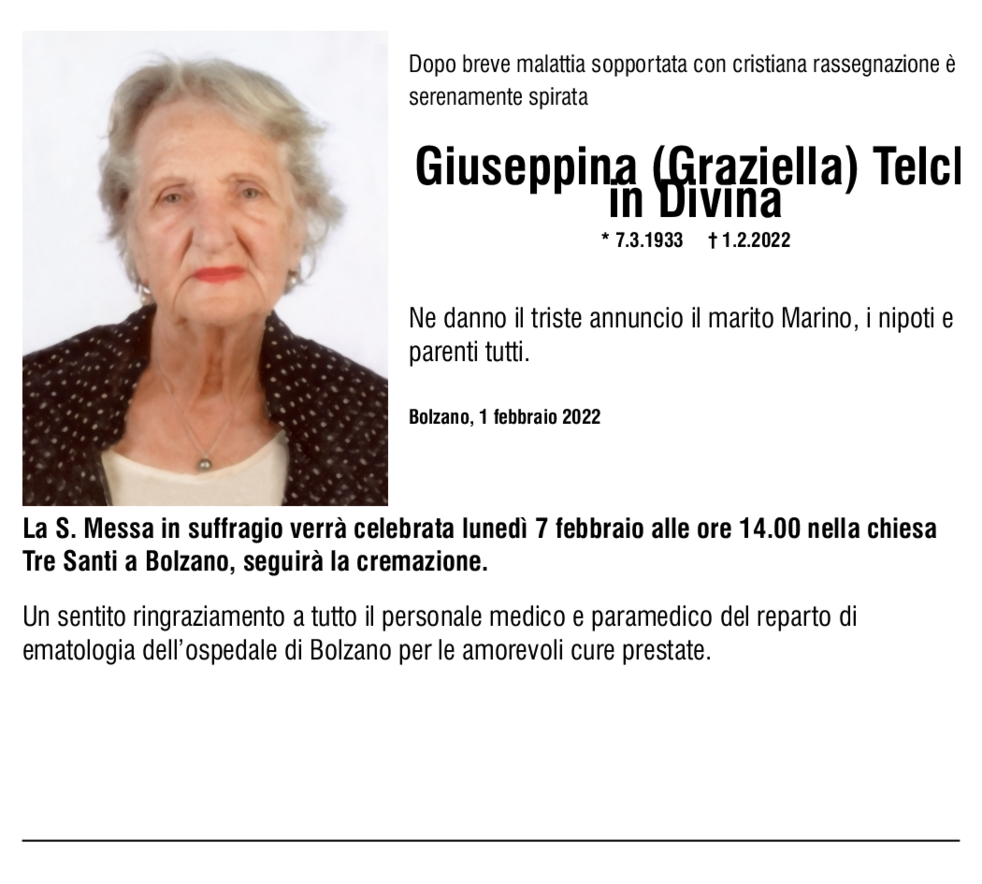 La S. Messa in suffragio verrà celebrata lunedì 7 febbraio alle ore 14.00 nella chiesa Tre Santi a Bolzano, seguirà la cremazione.