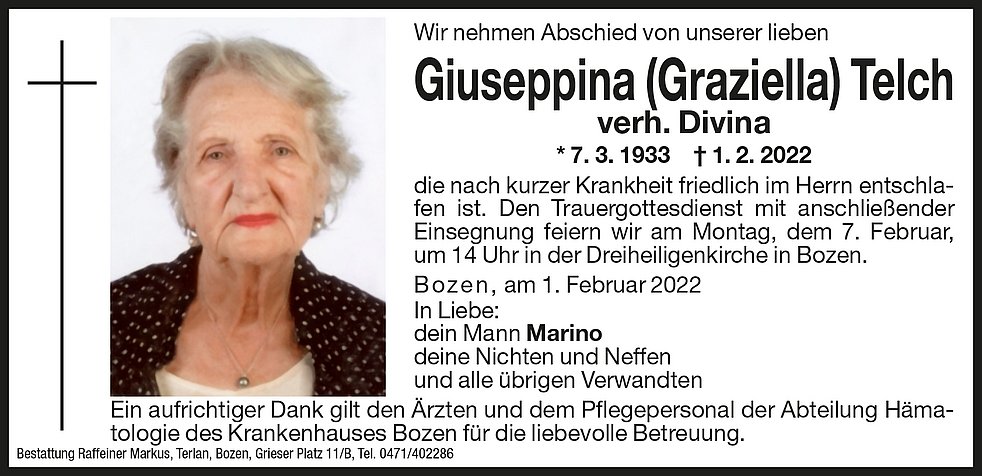 Den Trauergottesdienst mit anschlieβender Einsegnung feiern wir am Montag, dem 7. Februar, um 14 Uhr in der Dreiheiligenkirche in Bozen.