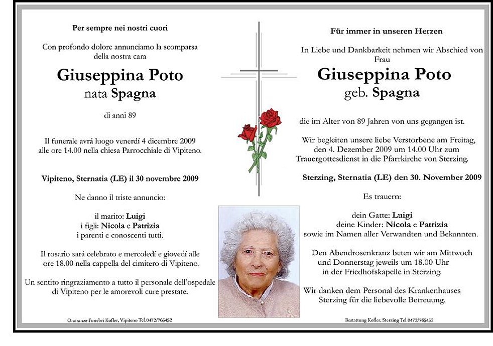 ore 18.00 nella cappella del cimitero di Vipiteno.